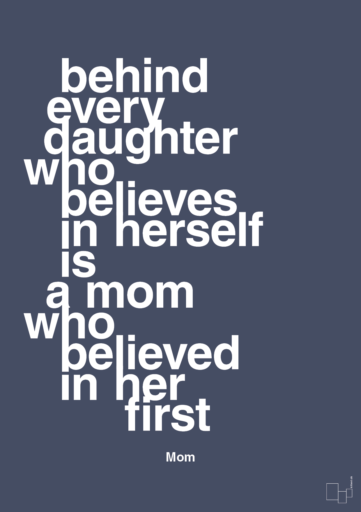 Denne typografiske plakat er en enkel, men stærk hyldest til relationen mellem mor og datter. Citatet “Behind every daughter who believes in herself is a mom who believed in her first” står i fokus med store, klare bogstaver, der skaber et markant grafisk udtryk på væggen. Teksten er på engelsk, men budskabet er universelt: selvtillid, opvækst og den trygge støtte fra en mor, der altid har troet på dig.