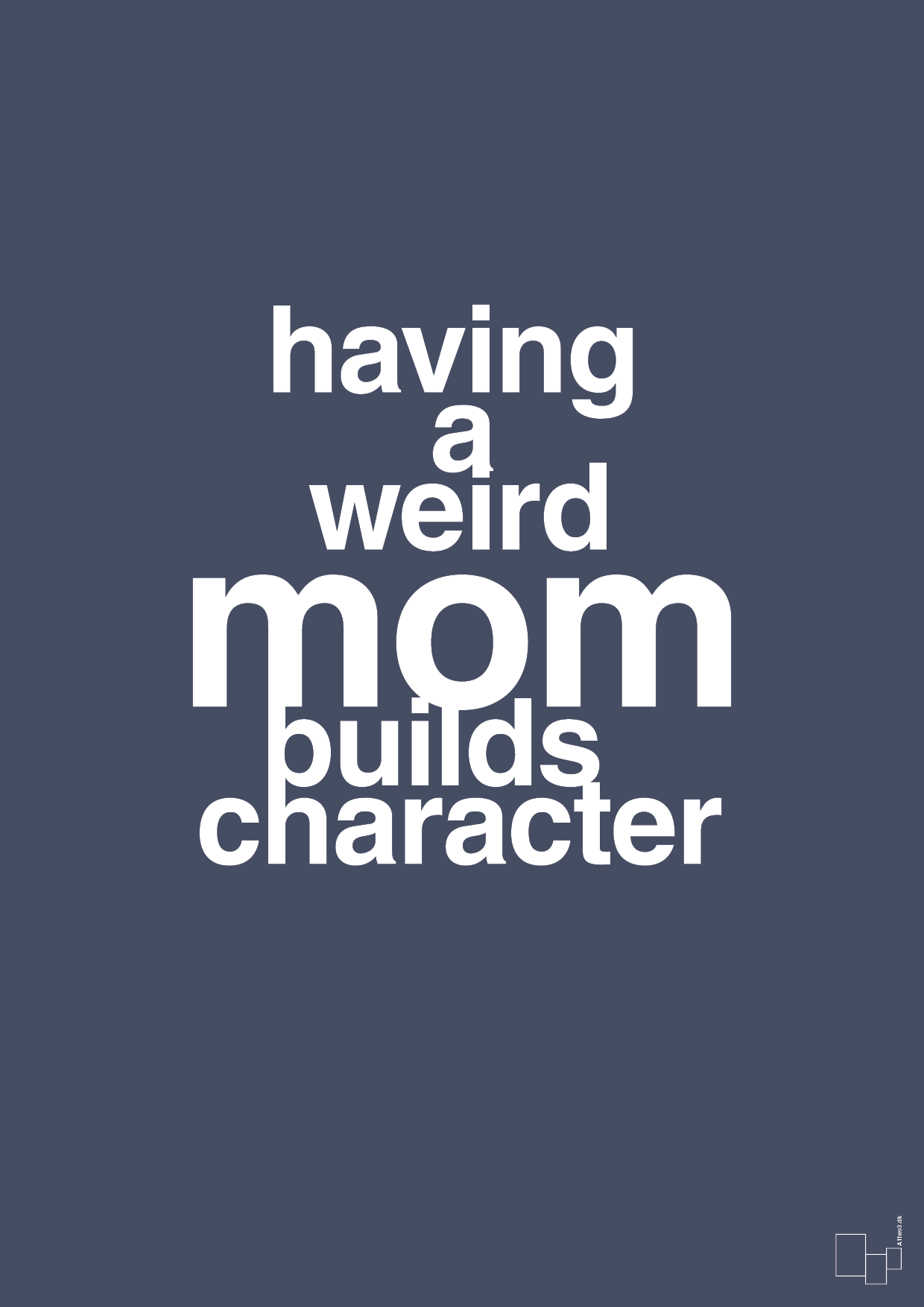 Designet er stramt og urbant med fokus på stærk, klar typografi, der fylder rummet og fanger blikket. Teksten står i centrum og bliver et moderne statement om familieliv, kærlighed og humor. Den fungerer perfekt som sjov gave til mors dag, fødselsdag, jul – eller som kærlig hilsen fra børnene til den “mærkelige” mor, der altid får jer til at grine.