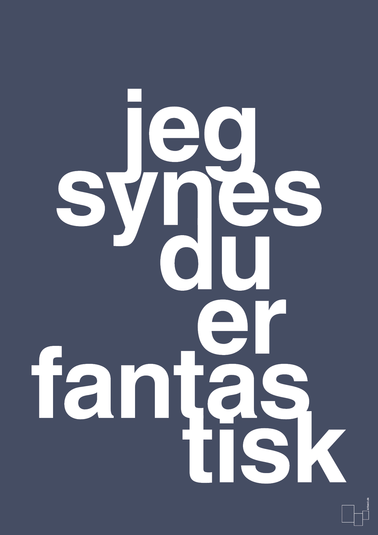 Denne typografiske plakat med teksten “jeg synes du er fantastisk” er skabt til at løfte humøret – hver eneste dag. De store, markante bogstaver fylder hele fladen og gør budskabet umuligt at overse. Udtrykket er enkelt, grafisk og skandinavisk, men samtidig varmt og personligt.