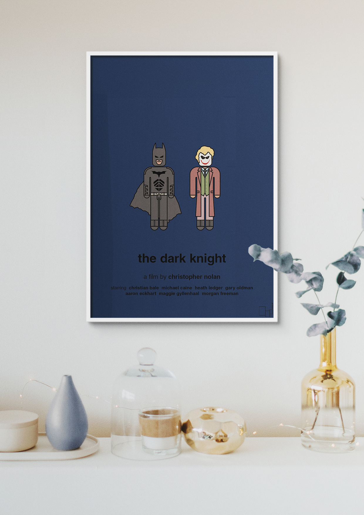 Denne Batman plakat er en moderne, grafisk hyldest til den legendariske film “The Dark Knight”. Med et stramt, minimalistisk design står mørkets ridder side om side med sin mest kaotiske modstander. De to figurer er fortolket i A1two3’s karakteristiske, typografiske og humoristiske stil, der forener superhelte-universet med skandinavisk designæstetik.