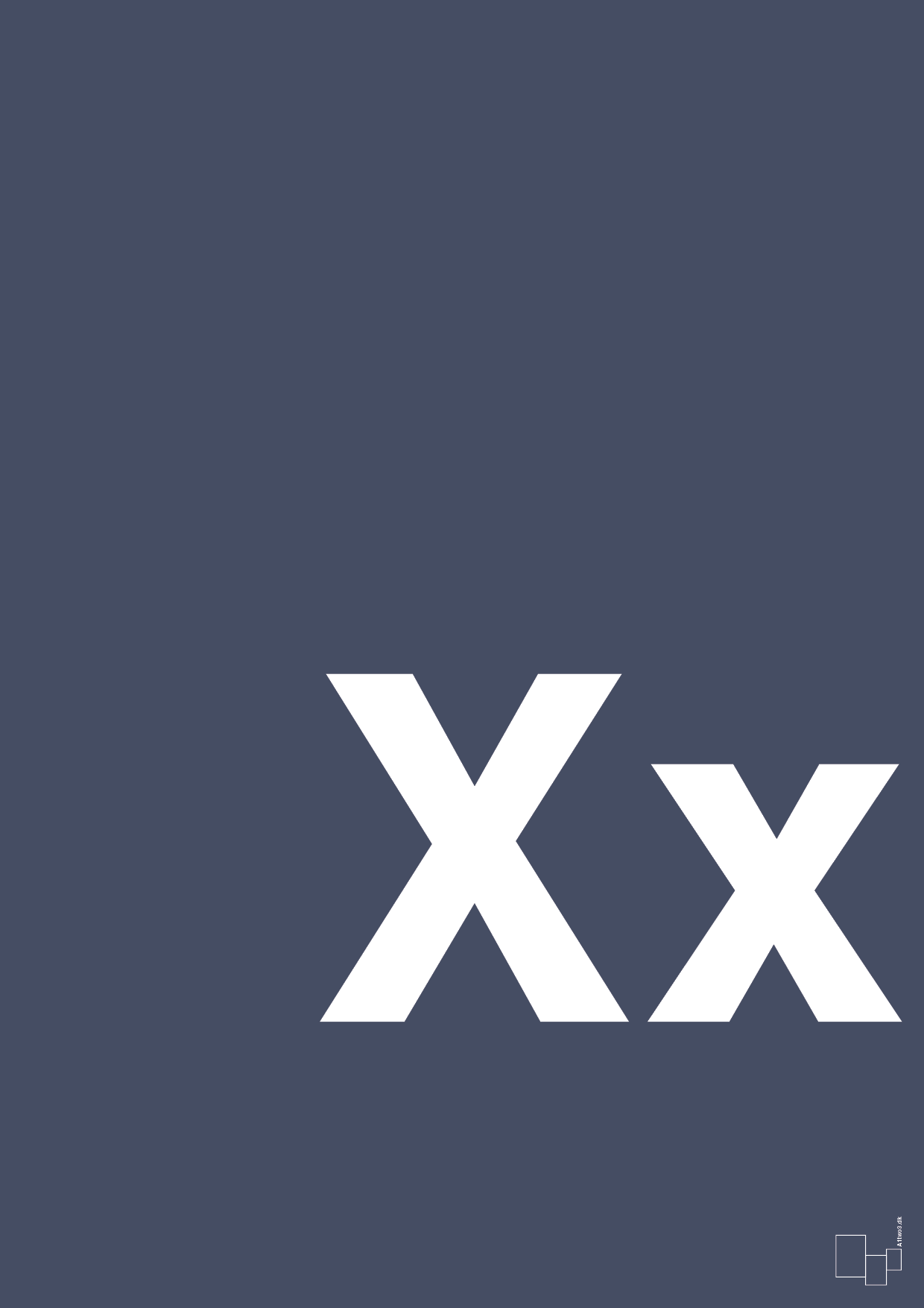 Plakaten viser bogstavet X i både stort og lille, sat op i en stram, skandinavisk komposition. Det gør den perfekt som: