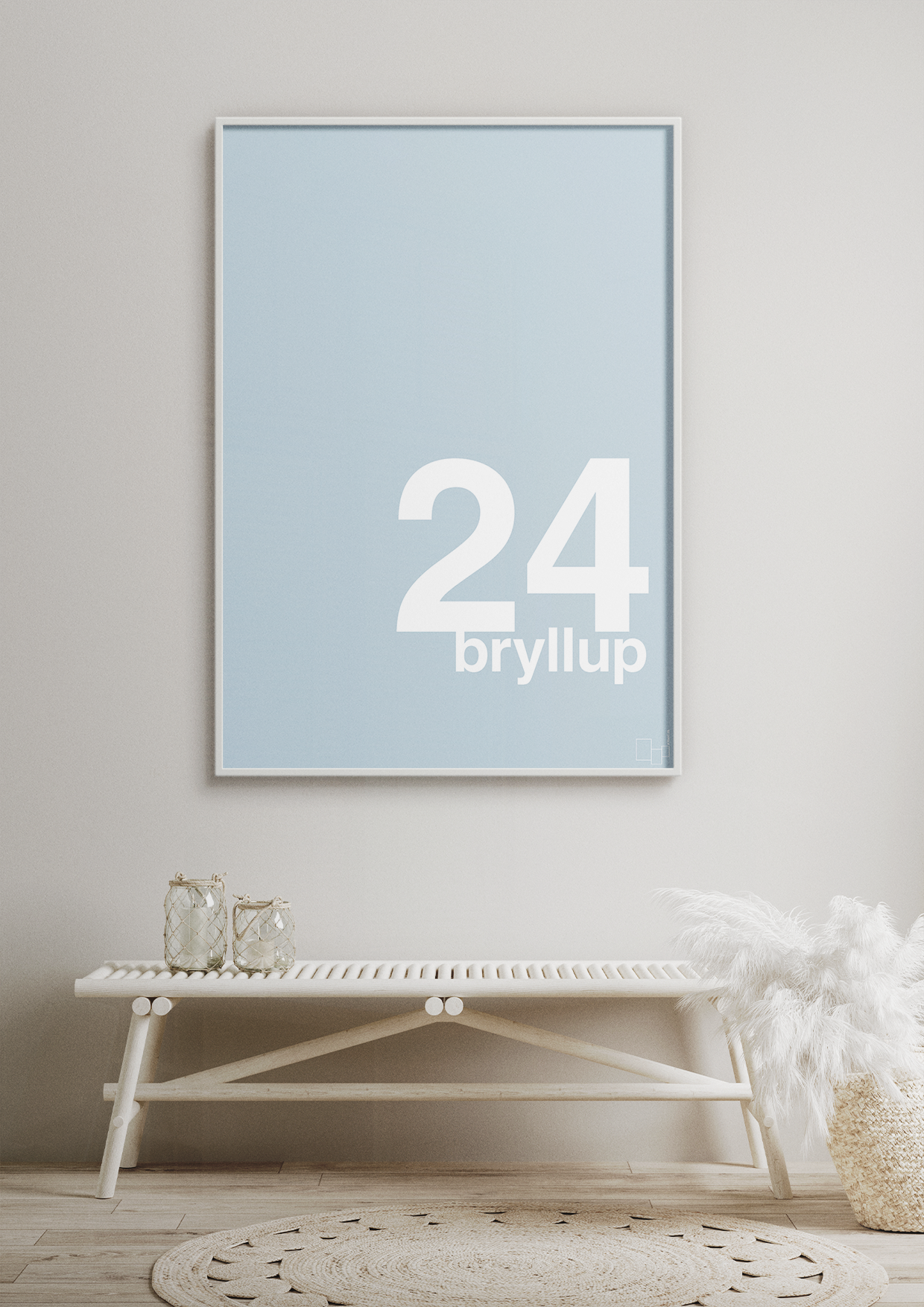 Denne bryllupsplakat er skabt til dig, der ønsker et stilrent og moderne minde om jeres store dag. Det grafiske udtryk er enkelt og markant: et stort tal i fokus, kombineret med ordet “bryllup” i klar typografi. Den minimalistiske komposition giver masser af ro – og masser af plads til at lade gæsterne skrive hilsner, lykønskninger og små anekdoter direkte på plakaten.