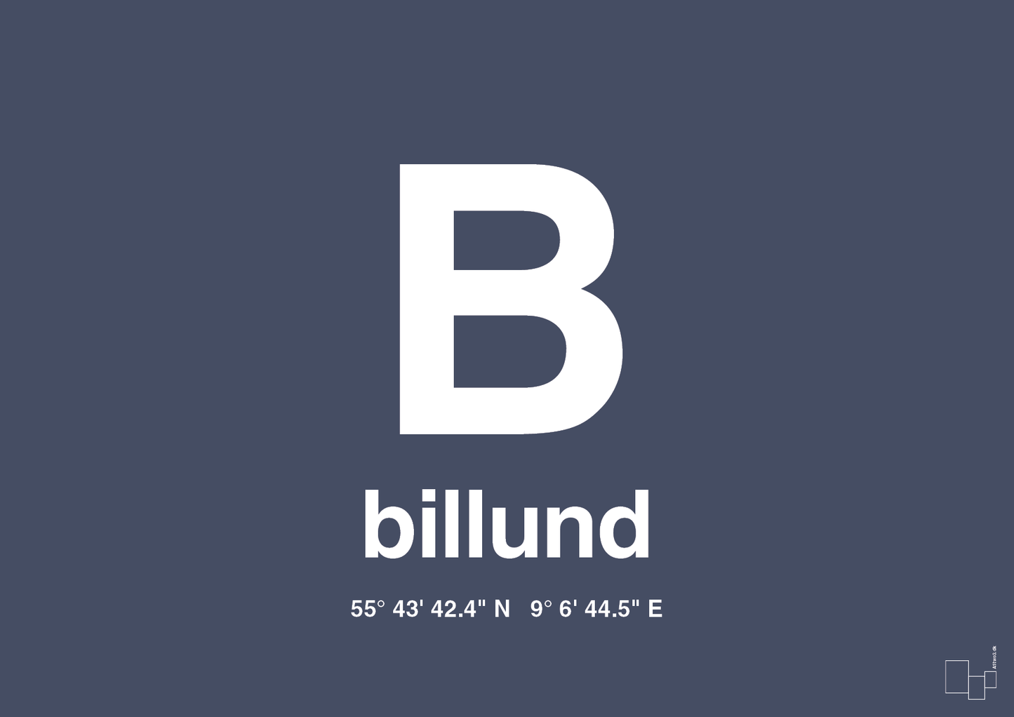 Plakaten viser Billund skrevet med klare bogstaver og byens GPS-koordinater placeret skarpt under navnet. Det giver et minimalistisk, næsten ikonisk look, der fungerer både som kunst og som personlig statement om, hvor du kommer fra, eller hvilket sted der betyder noget for dig.
