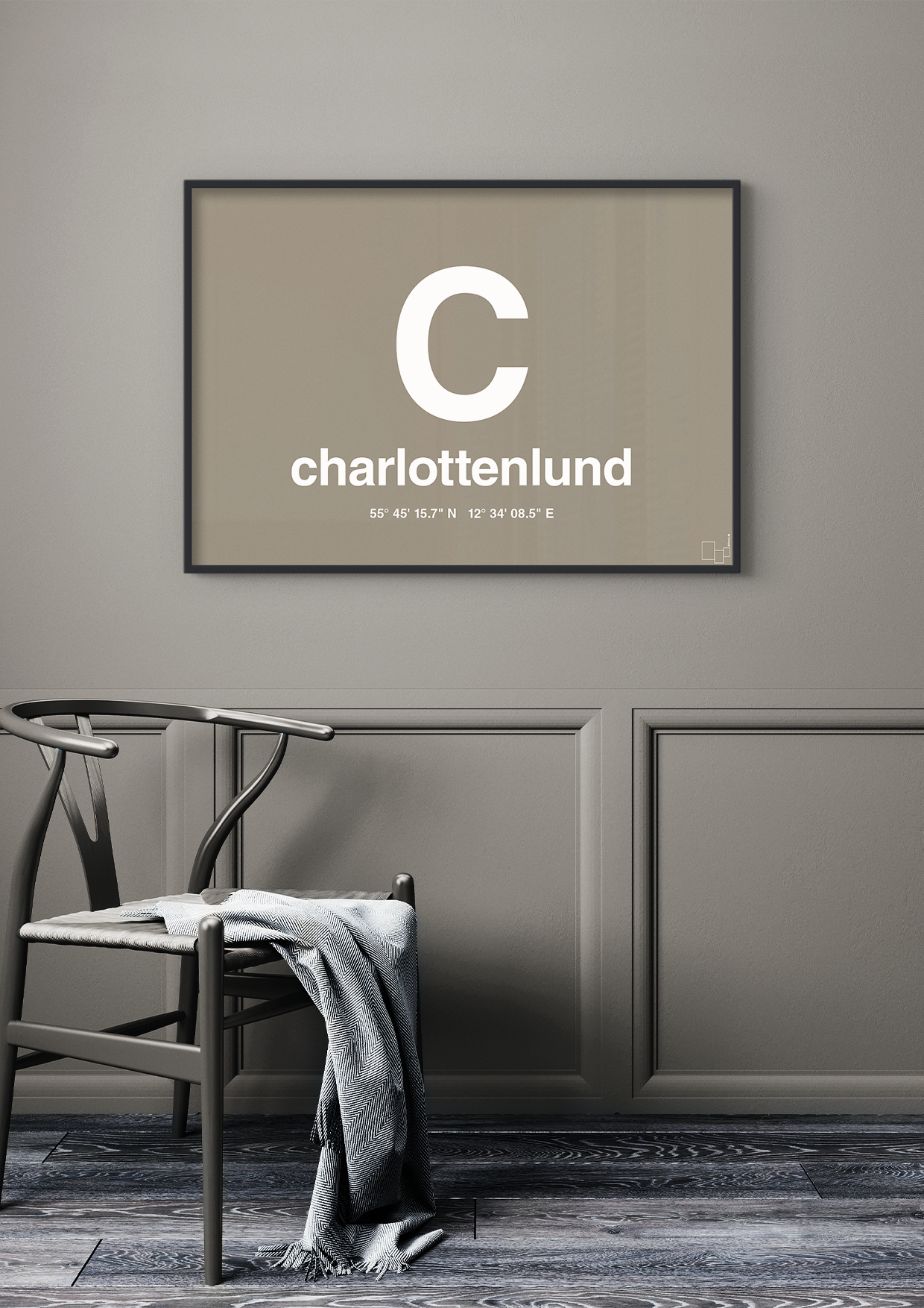 Under bynavnet er Charlottenlunds præcise GPS-koordinater angivet, så du får en stilfuld byplakat med koordinater, der skaber en direkte forbindelse til netop det sted, der betyder noget for dig – hvad enten det er barndomsgaden, den nuværende adresse eller drømmeområdet nord for København.