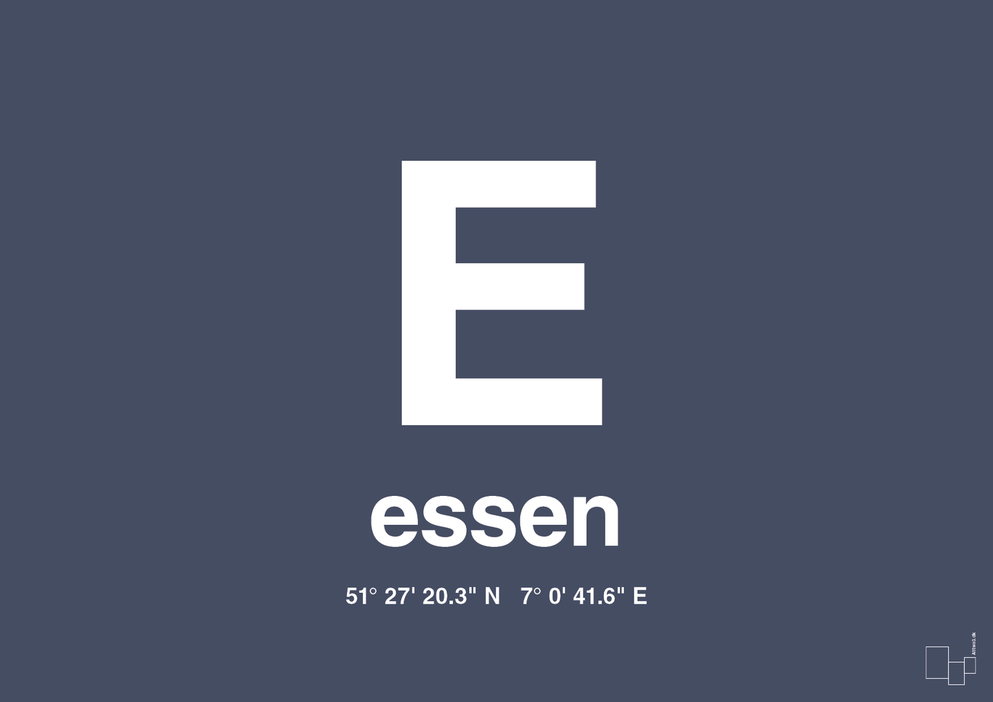 Denne minimalistiske byplakat hylder Essen med et markant grafisk udtryk, der forener typografi, geografi og personlig betydning. Det store, ikoniske “E” i centrum og bynavnet skrevet med rene linjer gør plakaten til et iøjnefaldende statement på væggen, mens de præcise koordinater under teksten placerer dit yndlingssted helt konkret på verdenskortet.