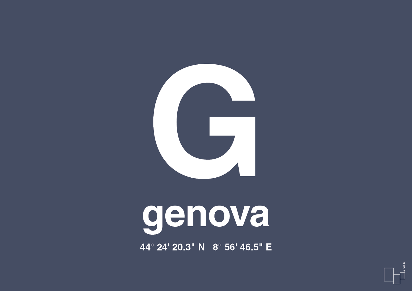 Plakaten er perfekt til dig, der har en særlig relation til Genova – hvad enten det er dine rødder, en uforglemmelig rejse eller en drømmedestination. Den store bogstavmarkering og de diskrete koordinater giver et moderne, grafisk look, som både fungerer alene og i en billedvæg med andre byplakater og rejseminder.