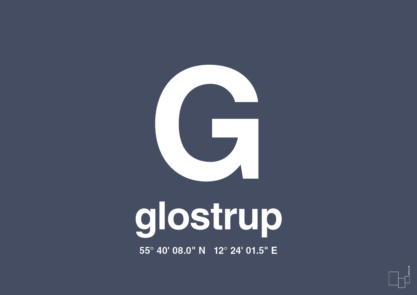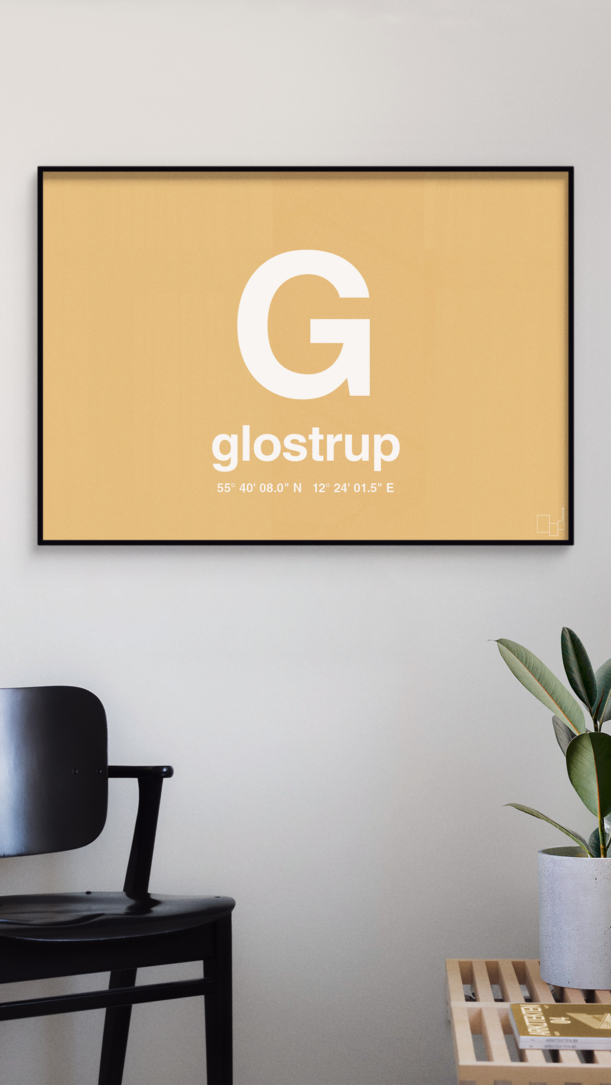 Plakaten er opbygget omkring typografien, hvor bogstavet og bynavnet glostrup står som tydelig visuel hovedperson. Under bynavnet finder du byens nøjagtige koordinater, som giver et diskret, men effektfuldt touch af city map art – uden kort, men med samme følelse af geografi og tilknytning.