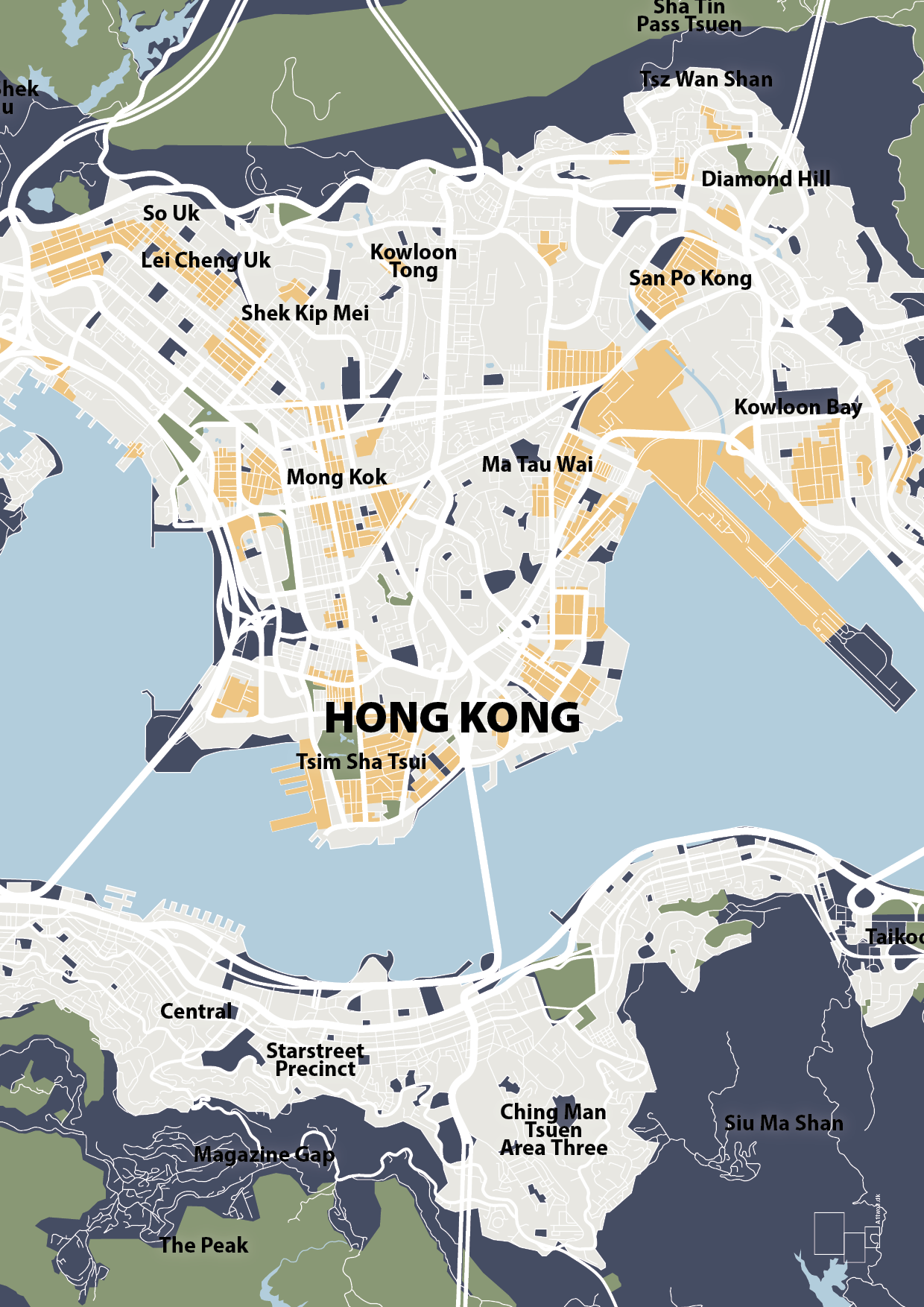 Denne byplakat over Hong Kong er et stilrent, grafisk bykort, hvor byens ikoniske havn og tætte gadenet er fortolket i et skarpt, skandinavisk design. De tydelige kvarterer som Central, Tsim Sha Tsui, Mong Kok og Kowloon Bay er markeret med store, læsbare navne, så du får et dekorativt kort, der samtidig er brugbart og let at gå på opdagelse i.