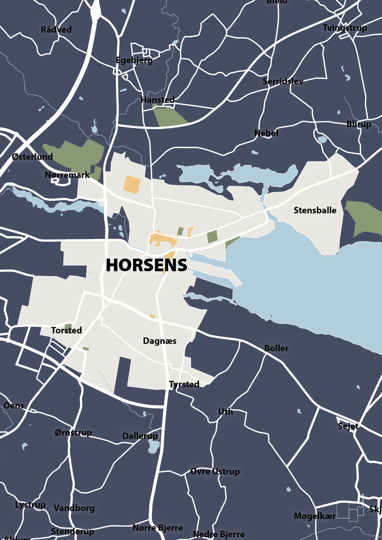 Denne byplakat over Horsens er til dig, der vil have byen helt tæt på – hver dag. Det grafiske bykort fremhæver Horsens’ karakteristiske struktur med havnen, fjorden, centrum og de omkringliggende bydele tydeligt markeret. Gaderne er tegnet op i rene linjer, mens kvarterer som Stensballe, Torsted, Dagnæs, Egebjerg og Tyrsted står skarpt og letlæseligt.