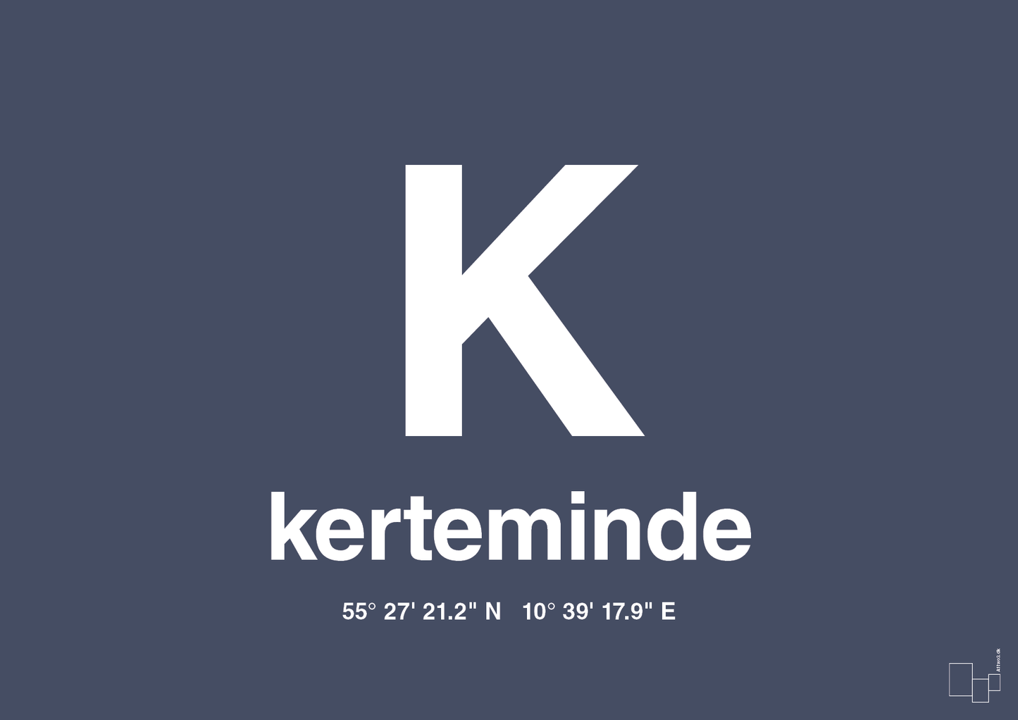Denne grafiske byplakat hylder Kerteminde med et rent, typografisk design, der lader byen træde tydeligt frem. Det store, markante “K” og bynavnet skrevet med klare bogstaver giver et enkelt, moderne udtryk, mens de præcise GPS-koordinater under teksten gør plakaten til en personlig reference til netop dit sted på kortet.