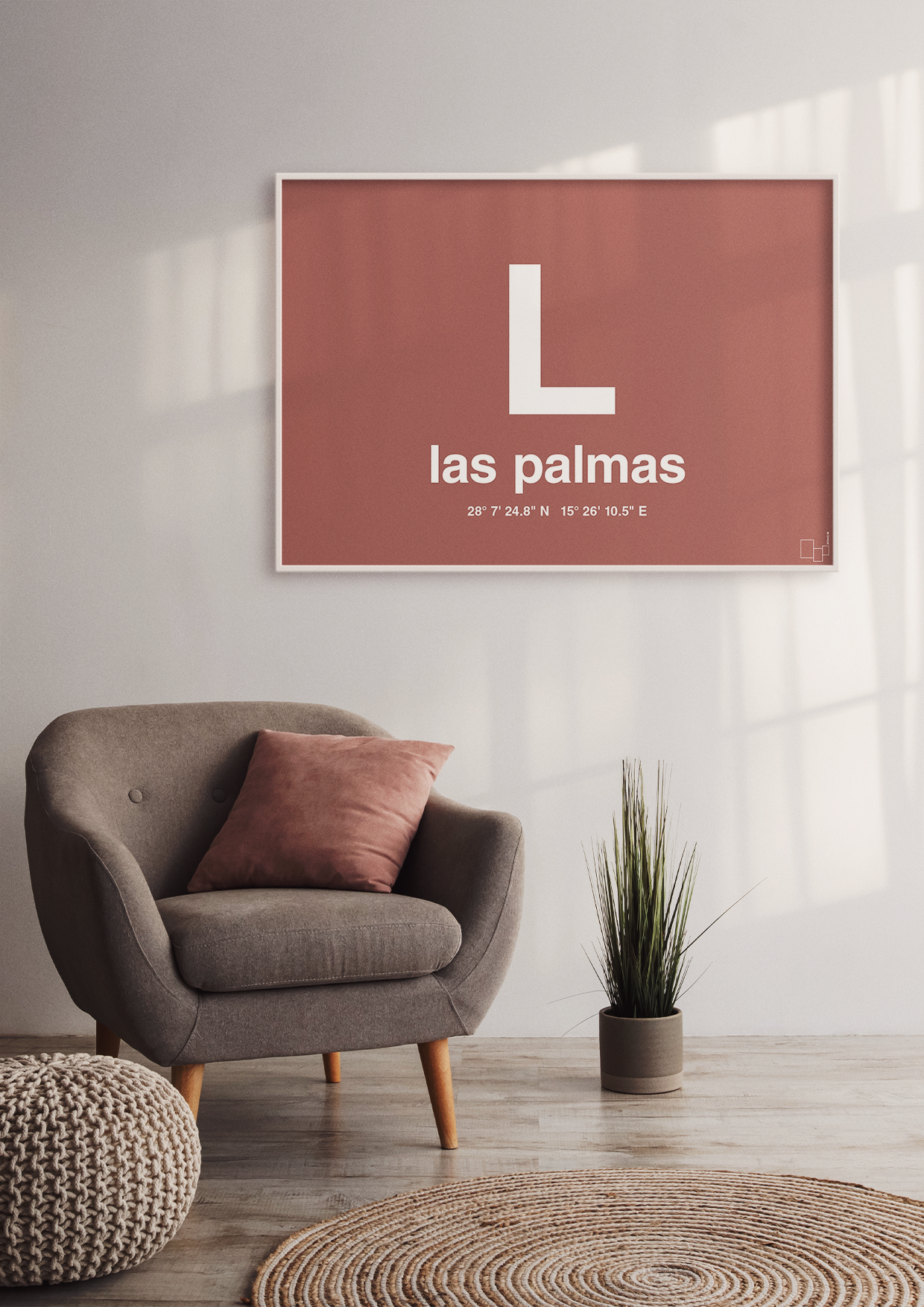 Denne stilrene byplakat med Las Palmas de Gran Canaria som motiv er til dig, der vil have en enkel og grafisk måde at vise din kærlighed til øens pulserende hovedstad. Plakaten samler byens navn og de eksakte geografiske koordinater i et skarpt, typografisk design, der giver associationer til både rejselyst, solrige minder og urban storbystemning.