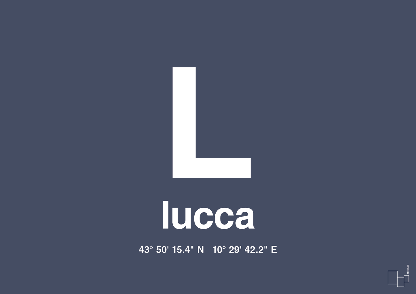 Denne byplakat med Lucca og byens geografiske koordinater er skabt til dig, der vil have rejselyst, minder og design samlet i ét enkelt kunstværk. Plakaten kombinerer et markant, grafisk “L”, bynavnet skrevet med ren typografi og de præcise koordinater, der pinpointer Lucca på verdenskortet.