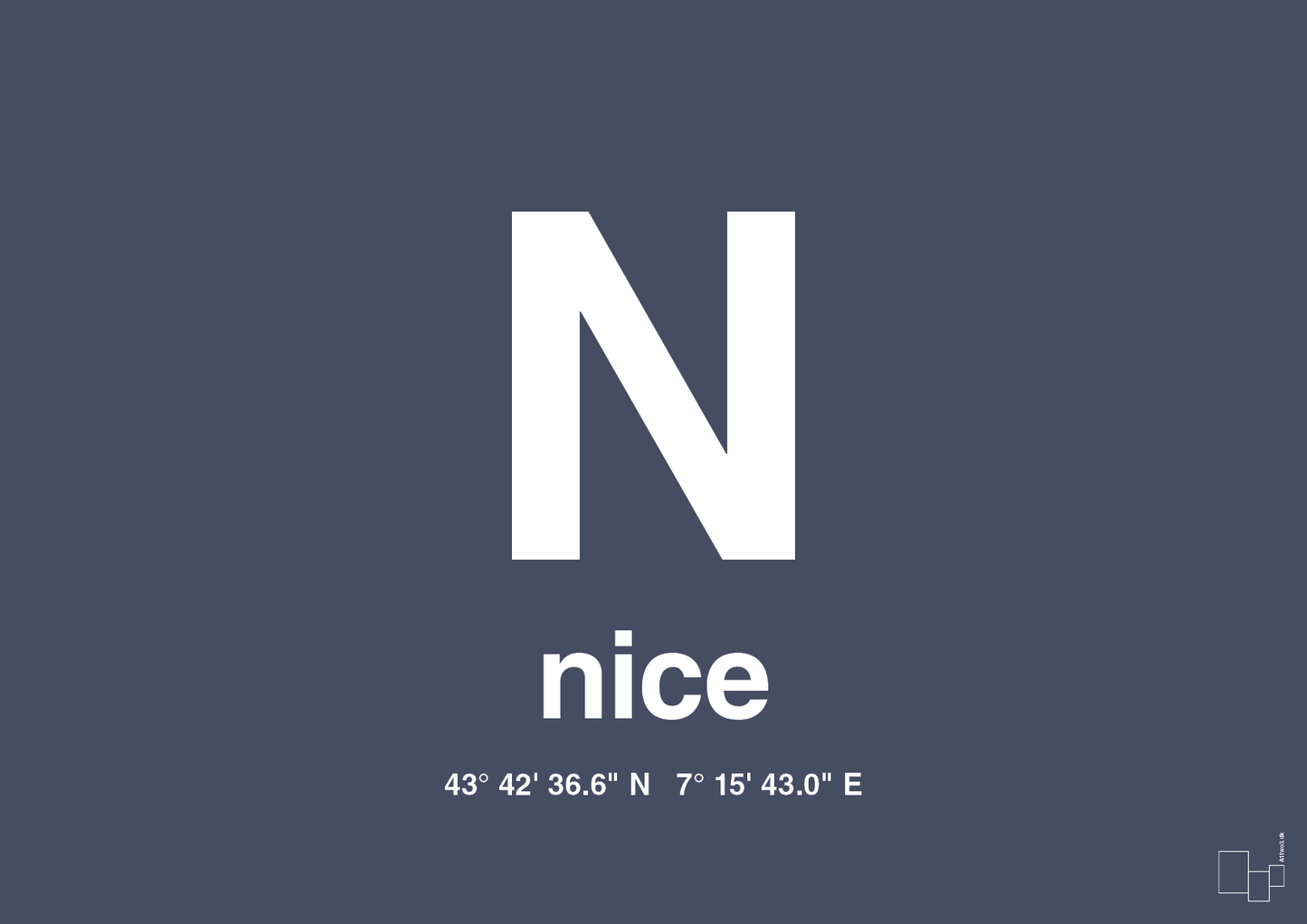 Denne byplakat med Nice er skabt til dig, der elsker Côte d’Azur, sol, strandpromenader og sydfransk stemning – og gerne vil have den følelse med hjem på væggen. Med et stort, markant “N”, bynavnet skrevet i en ren typografi og byens eksakte koordinater, får du en moderne Nice plakat, der både er dekorativ og personlig.