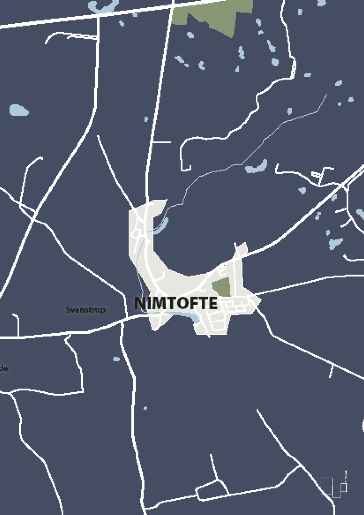 Uanset om Nimtofte er din hjemby, ferieminde eller blot en del af din historie, gør denne bykort plakat det nemt at få din personlige geografi integreret i indretningen – med et rent, grafisk og gennemført dansk design.