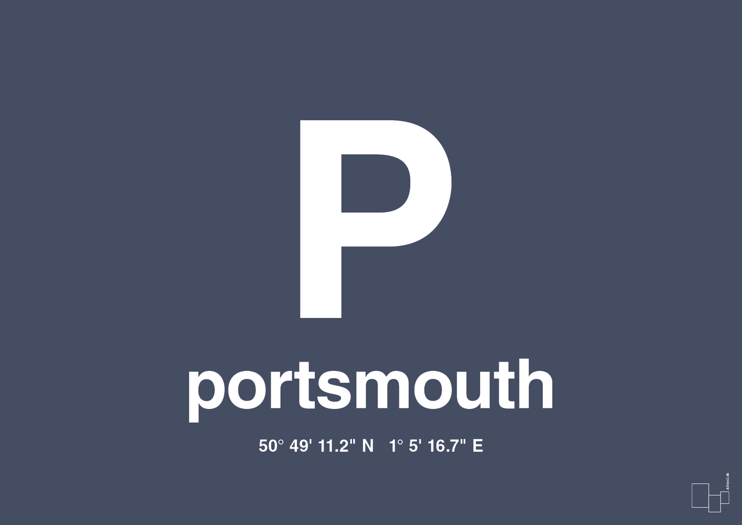 Denne minimalistiske byplakat hylder havnebyen Portsmouth med et markant grafisk udtryk. Det store, typografiske “P” dominerer motivet og gør plakaten både enkel, genkendelig og iøjnefaldende. Under bogstavet står bynavnet “portsmouth” rent og skarpt, efterfulgt af byens eksakte GPS-koordinater – en diskret, men personlig detalje for dig, der har en særlig tilknytning til byen.