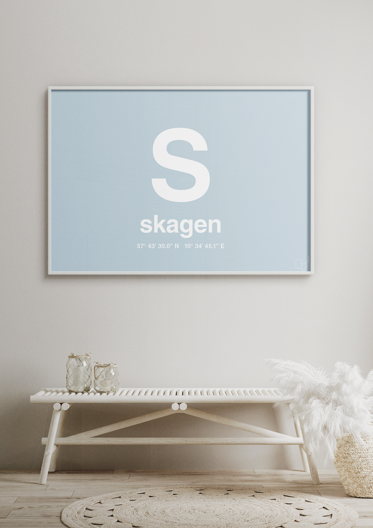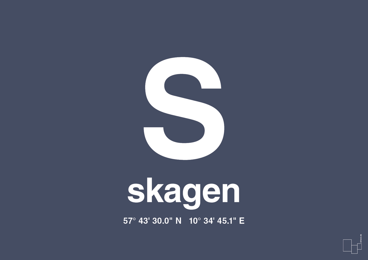 Denne minimalistiske byplakat hylder Skagen på den mest enkle og effektfulde måde. Et stort, markant “S” dominerer motivet, mens bynavn og præcise GPS-koordinater er placeret skarpt og harmonisk under bogstavet. Resultatet er en moderne Skagen plakat, der fungerer som både kunst, designstatement og personlig reference til Danmarks nordligste punkt.