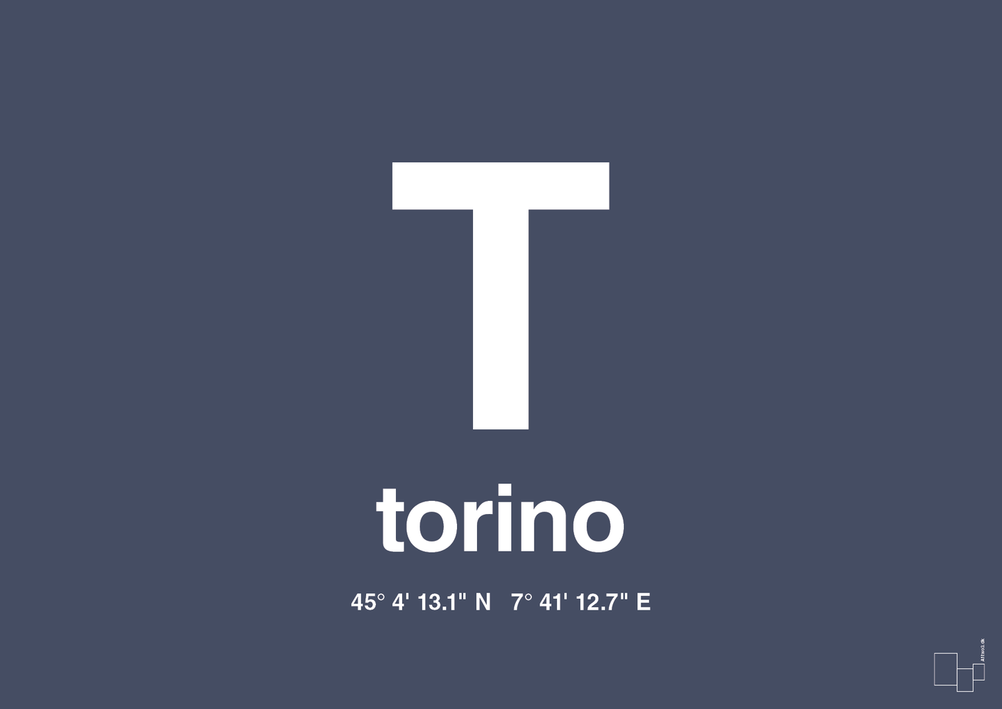 Denne byplakat med Torino er til dig, der elsker italiensk storbystemning, fodbold, arkitektur – eller måske bare har et særligt minde fra byen ved foden af Alperne. Plakaten samler hele følelsen af Torino i et rent og grafisk udtryk: ét markant bogstav, byens navn og de præcise GPS-koordinater, der peger direkte på byen.