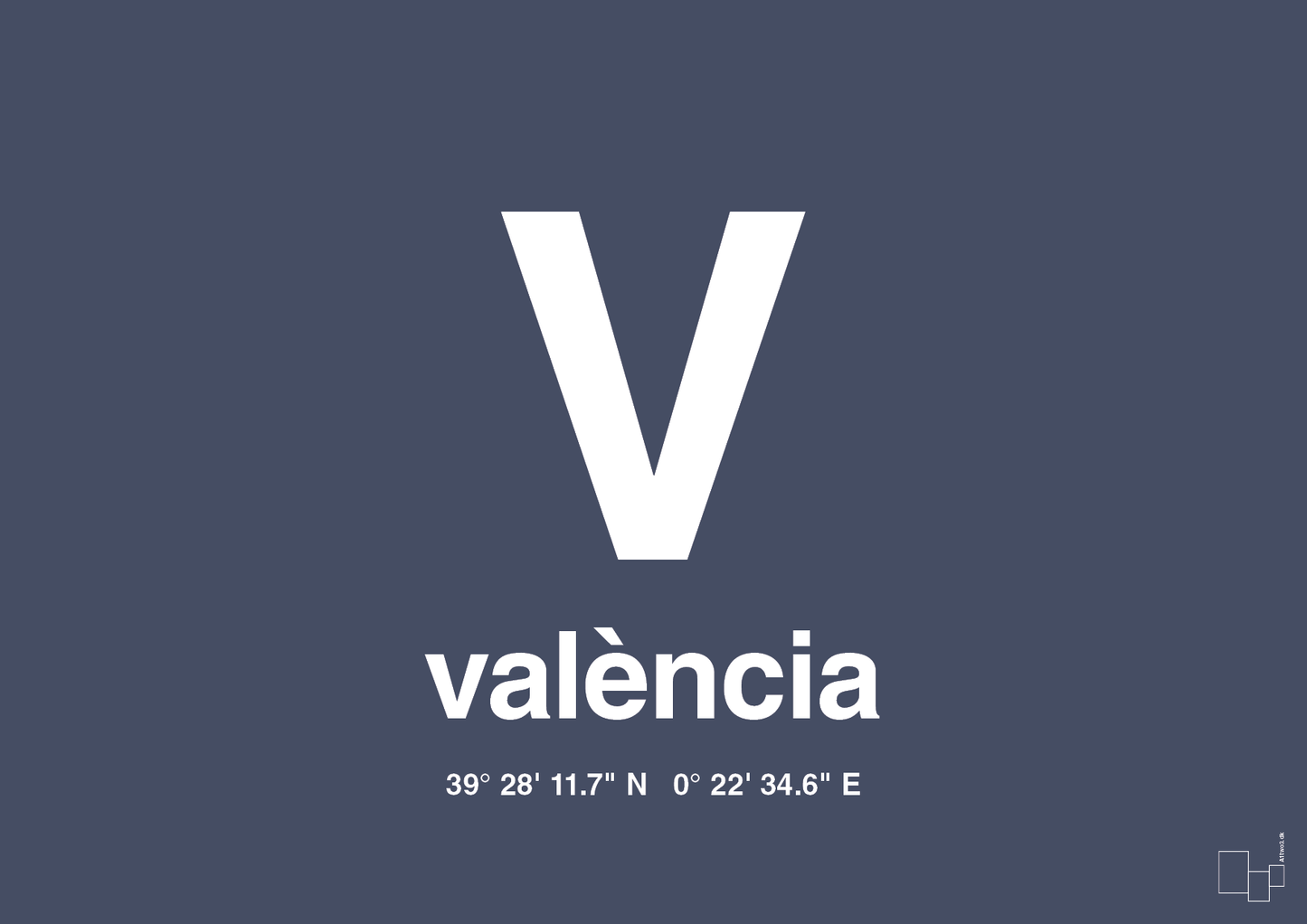 Plakaten er designet i et rent, typografisk udtryk, hvor fokus er på bogstavformen, bynavnet og de præcise GPS-koordinater. Det giver en urban, næsten arkitektonisk følelse – som et diskret minde om din yndlingsby, en uforglemmelig ferie eller en vigtig livsbegivenhed i Valencia.
