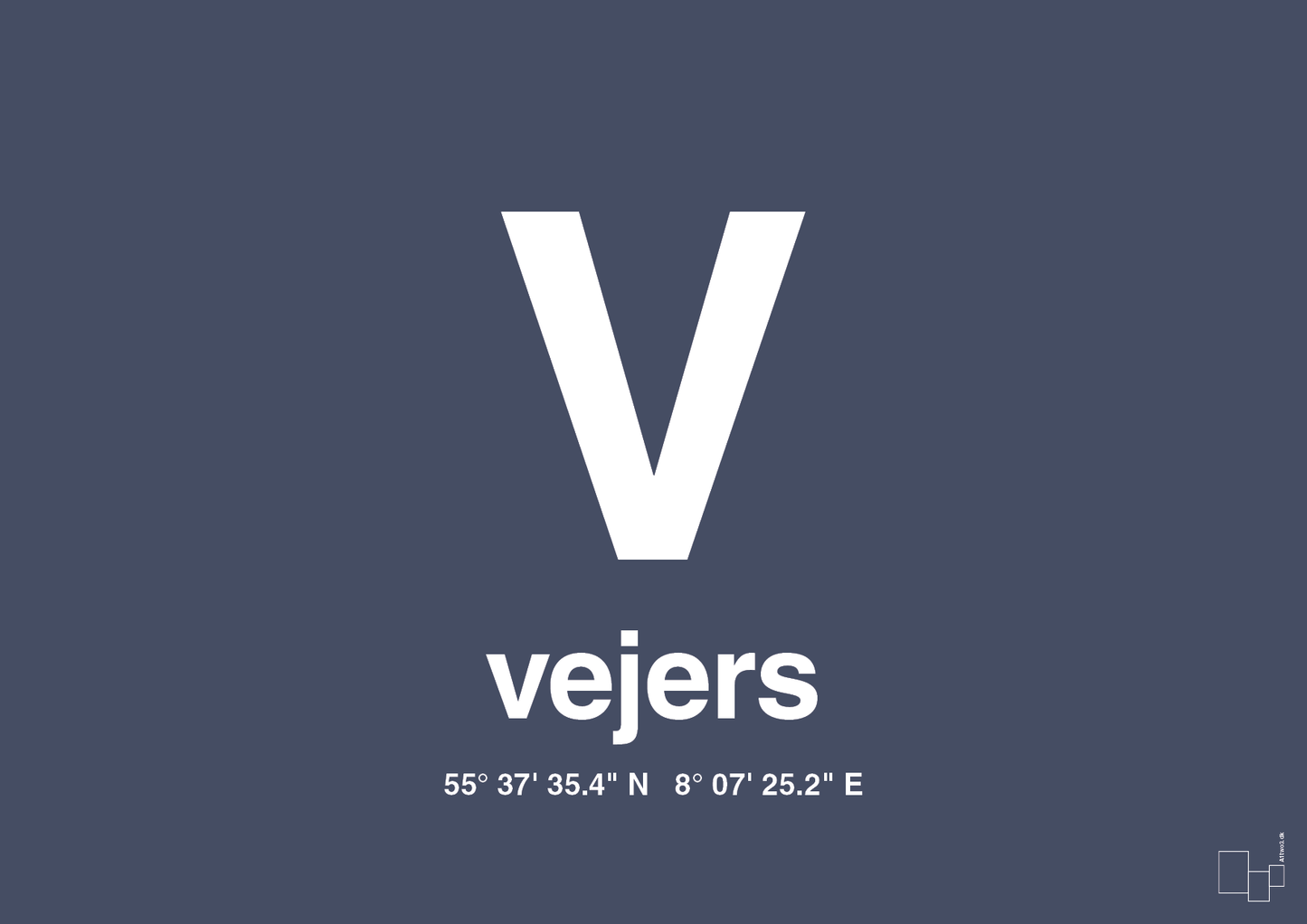 Giv din bolig et enkelt, grafisk statement med denne stilrene Vejers plakat med koordinater. Det store, markante “V” og den klare typografi gør plakaten til en moderne byplakat, der hylder den ikoniske vestkystby på en diskret og designbevidst måde. Under bynavnet står de præcise GPS-koordinater for Vejers, så du altid har dit personlige pejlemærke hængende på væggen.