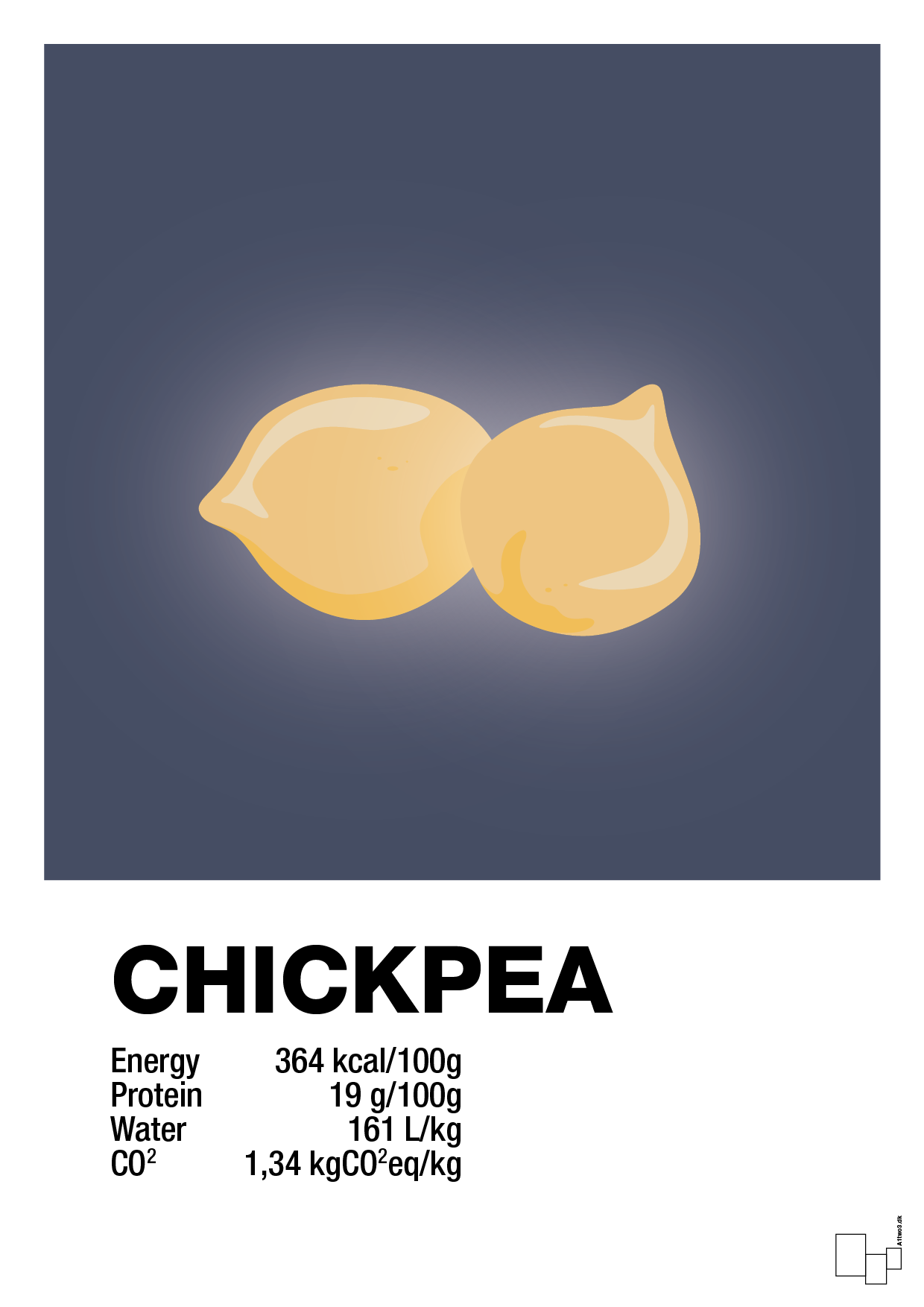 Denne moderne madplakat fra A1two3 sætter kikærten i centrum – både som plantebaseret proteinkilde og som klimavenligt valg. Den enkle illustration af kikærter kombineret med tydelig typografi giver dig et hurtigt overblik over energi, proteinindhold, vandforbrug og CO₂-udledning pr. kilo, baseret på data fra Our World in Data.