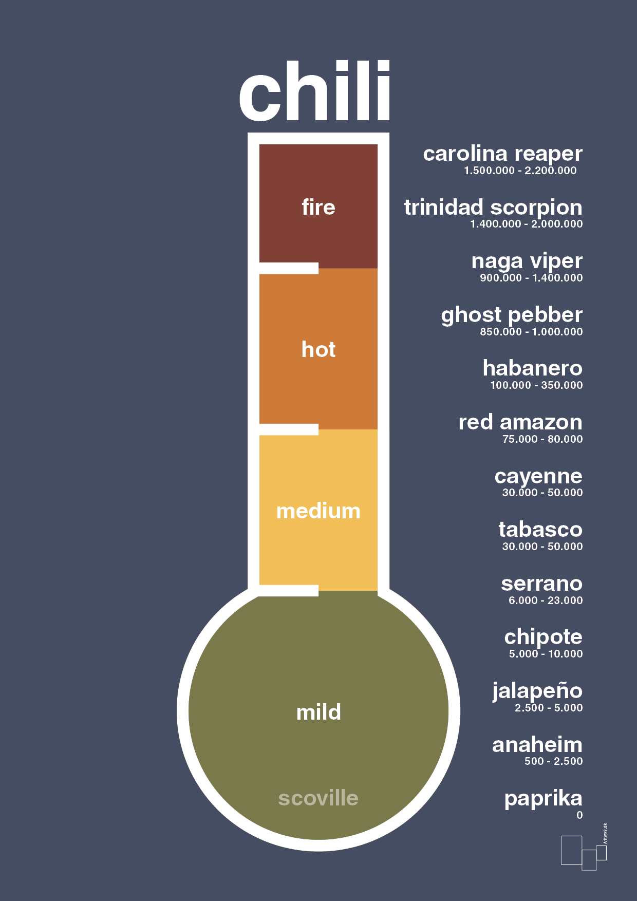 Motivet kombinerer minimalistisk grafik med konkret viden om chilistyrke og er oplagt som gave til chili-elskeren, grillmesteren eller den hjemlige kok, der altid lige skal ”skrue en tand op”. Det stramme layout og de klare kontraster gør plakaten velegnet både alene og som del af en billedvæg.
