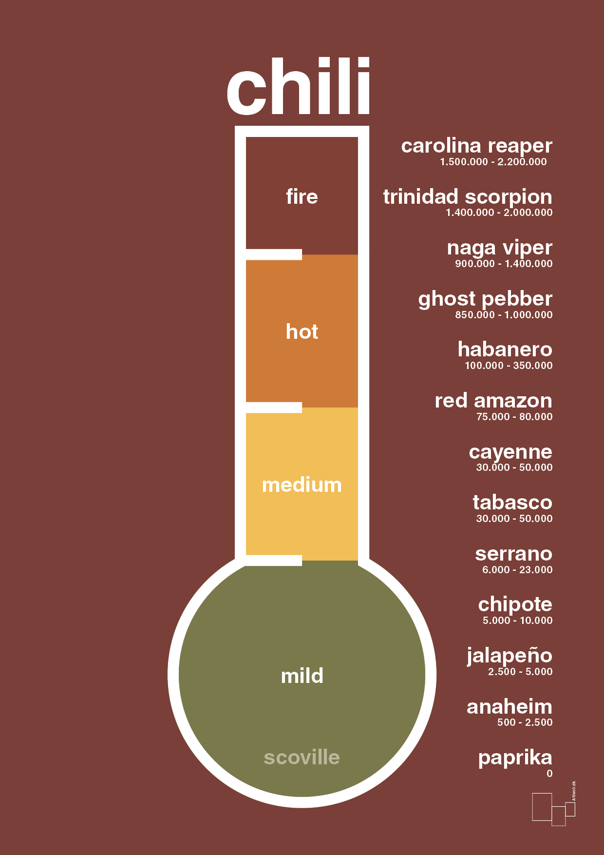 Plakat med chili styrke - som måles i scoville. Perfekt til dig som elsker chili, chili smagning og går op i Carolina Reaper, Ghost Pebber, Habanero, Chipote og alle de andre chili.