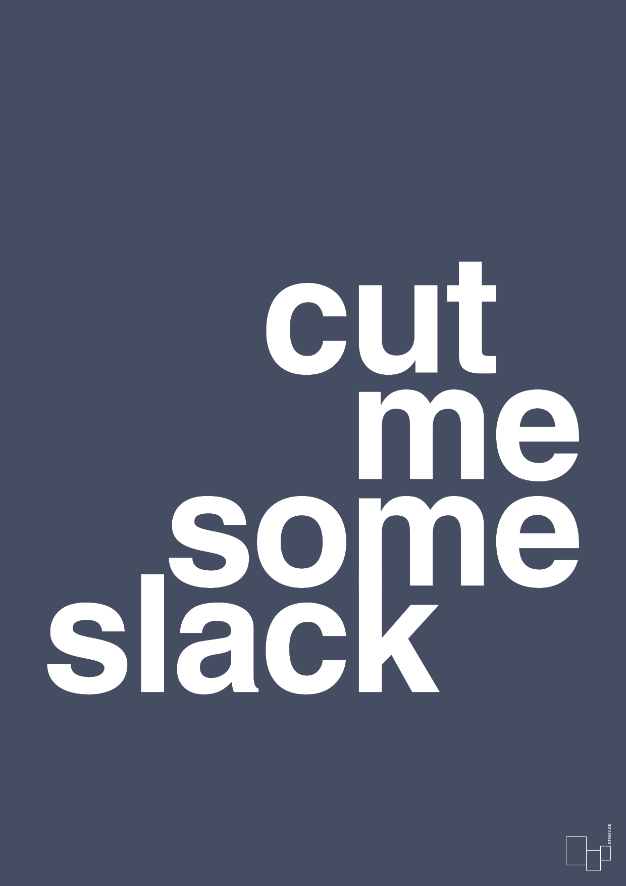 Denne grafiske plakat med teksten “cut me some slack” er til dig, der elsker humor, selvironi og et afslappet mindset i hverdagen. Det enkle typografiske design og den klare kontrast i layoutet gør budskabet skarpt, mens den legende komposition giver rummet et løft af feel good-energi.