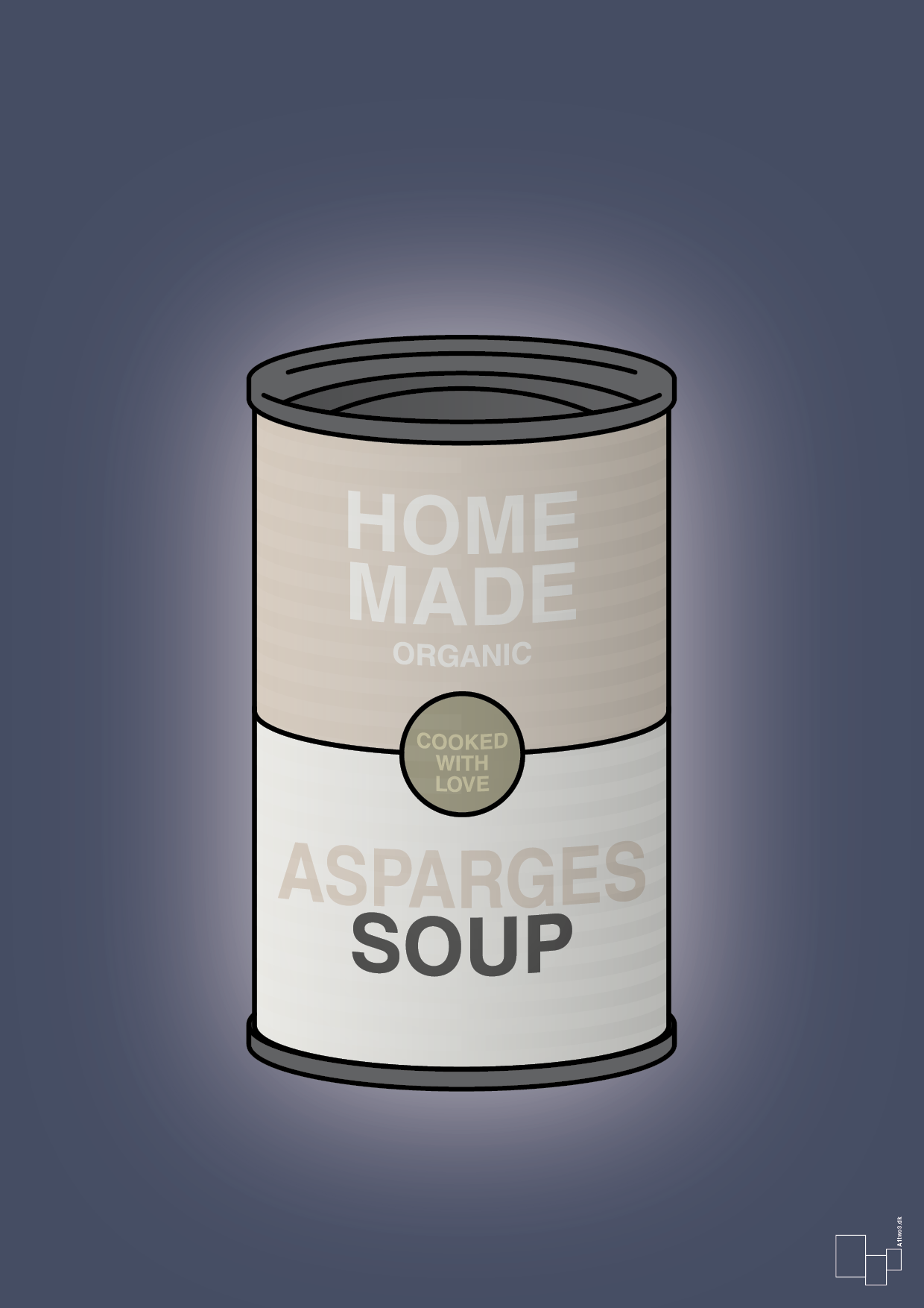 Denne stilrene plakat med en ikonisk dåse aspargessuppe er skabt til dig, der elsker grafisk design, humor og god mad. Motivet er enkelt: en klassisk suppedåse med tydelig typografi, bløde skygger og teksten “Home made – cooked with love” og “Asparges soup”, der giver et kærligt nik til retro køkkendesign og pop art.