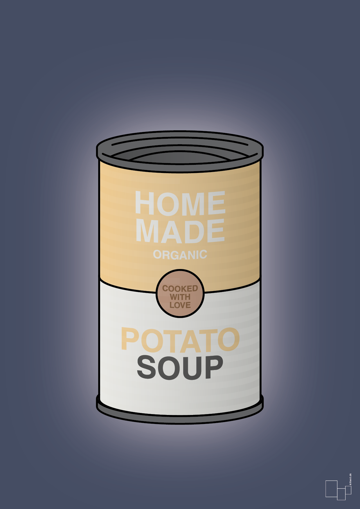 Denne plakat fra A1two3 hylder den klassiske dåsesuppe og giver dit køkken et legende, grafisk twist. Motivet viser en stiliseret dåse “Potato Soup” med tydelig typografi og budskaber som “Home Made”, “Organic” og “Cooked With Love” – en kærlig hilsen til hjemmelavet comfort food forklædt som cool, urban plakatkunst.
