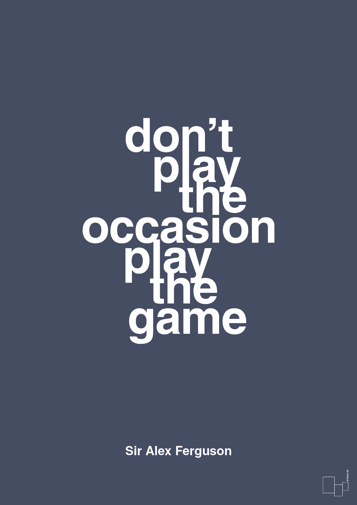 Denne typografiske plakat samler essensen af vindermindset i én sætning: “don’t play the occasion, play the game”. Et ikonisk citat fra den legendariske fodboldtræner Sir Alex Ferguson, sat op i et skarpt, grafisk design der rammer lige i hjertet på alle, der elsker fodbold, taktik og mental styrke.