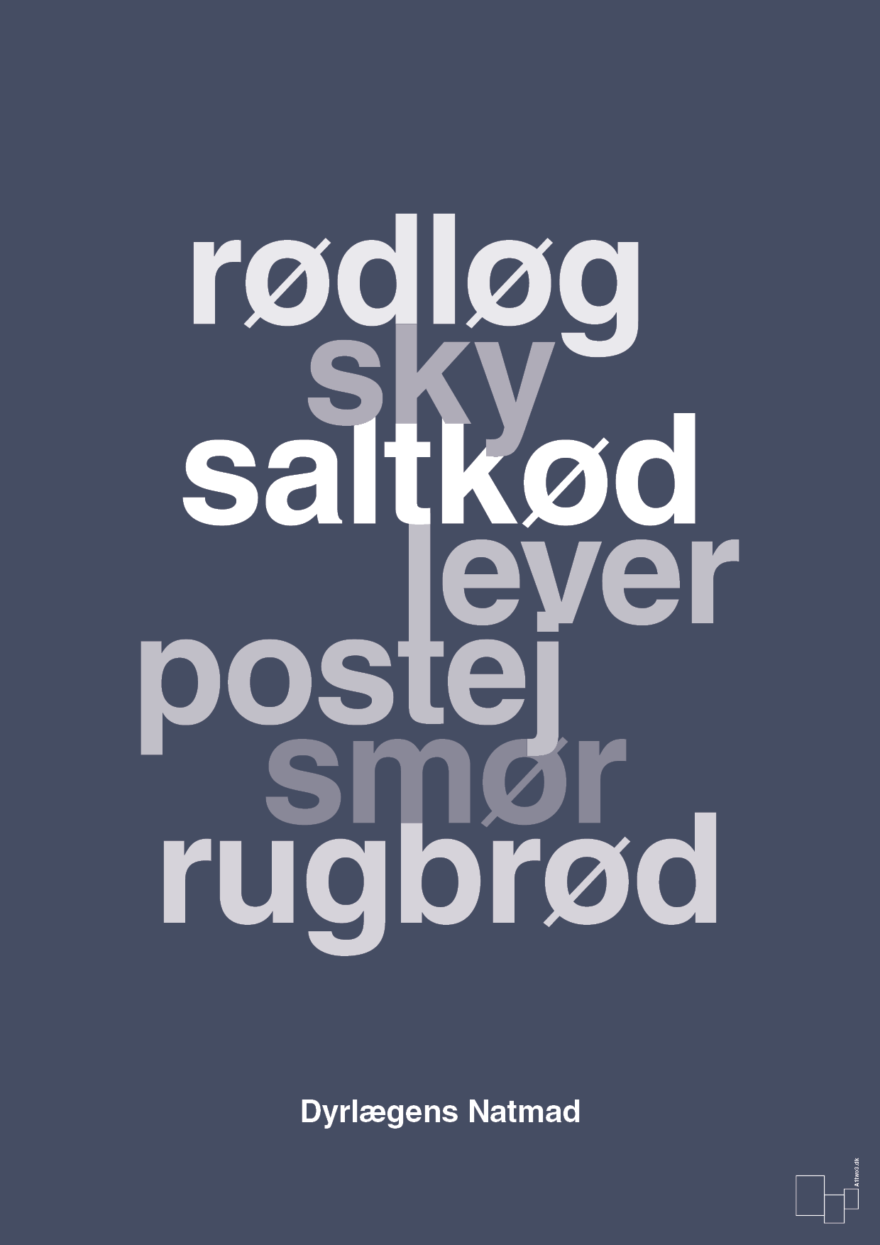 Denne plakat hylder en ægte klassiker i dansk smørrebrød: dyrlægens natmad. Med en stram, typografisk opsætning står de velkendte ingredienser som grafiske byggeklodser: rugbrød, smør, leverpostej, salt kød, sky og rødløg. Ordene er lagt oven på hinanden i varierende størrelser, så både komposition og rytme minder om lagene i et stykke luksusmad på tallerkenen.