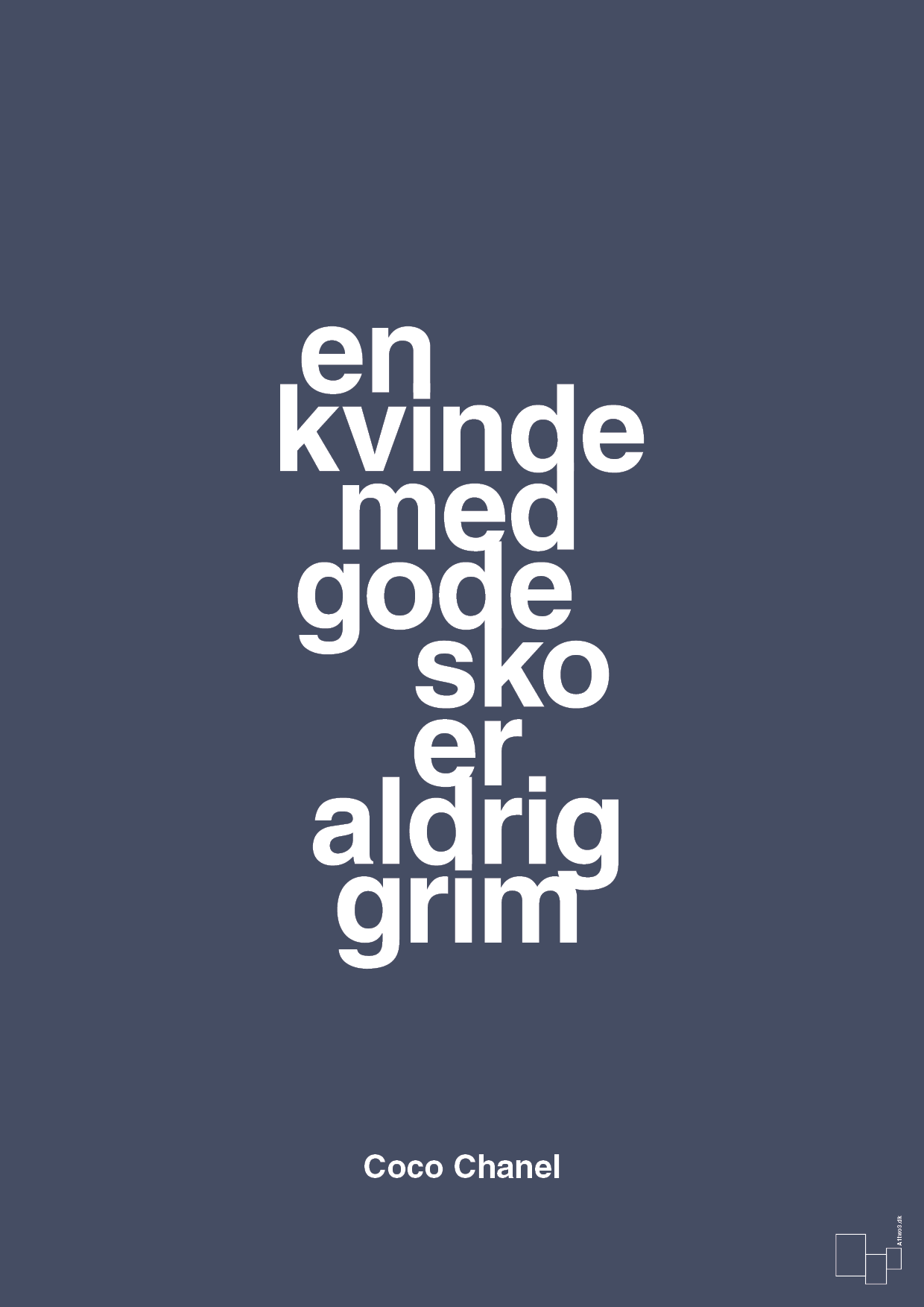 “En kvinde med gode sko er aldrig grim” – et ikonisk Coco Chanel citat, der rammer lige ned i kærligheden til sko, stil og selvtillid. Denne typografiske plakat fra A1two3 fortolker citatet i et stramt, grafisk layout, hvor ordene står som en lodret søjle midt på plakaten. De store, rene bogstaver skaber et moderne, skandinavisk udtryk, der fungerer som både kunstværk og statement piece på væggen.