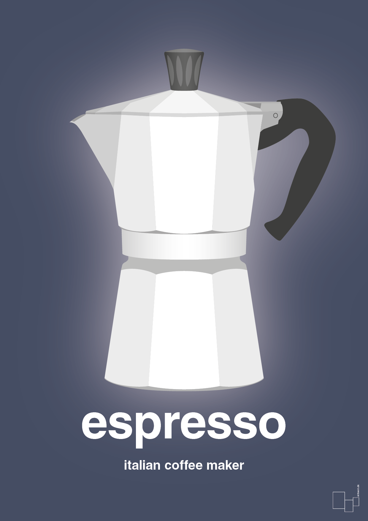 Denne plakat er en hyldest til den klassiske italienske espressokande – et uundværligt ikon i ethvert kaffehjem. Det stilrene, grafiske motiv fremhæver kanden i et minimalistisk, skandinavisk udtryk med fokus på form, lys og skygge. Nederst står ordet “espresso” i stor, tydelig typografi, der giver plakaten et moderne, urbant look og gør den oplagt som statement-piece i indretningen.