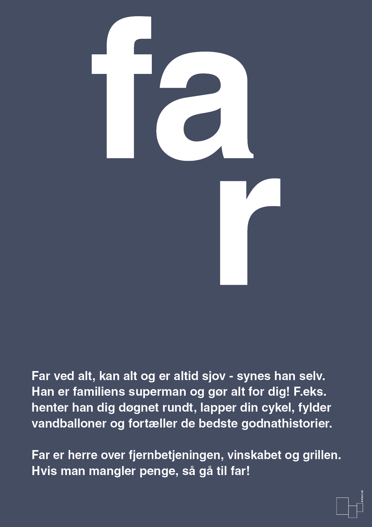Denne typografiske far-plakat er en kærlig – og lidt selvironisk – hyldest til familiens helt. Det store ord “far” fylder motivet og understreger, hvor vigtig han er, mens den humoristiske tekst nedenunder beskriver ham som husets supermand, cykellapper, godnathistorie-mester, grill-konge og livline, når man mangler penge.
