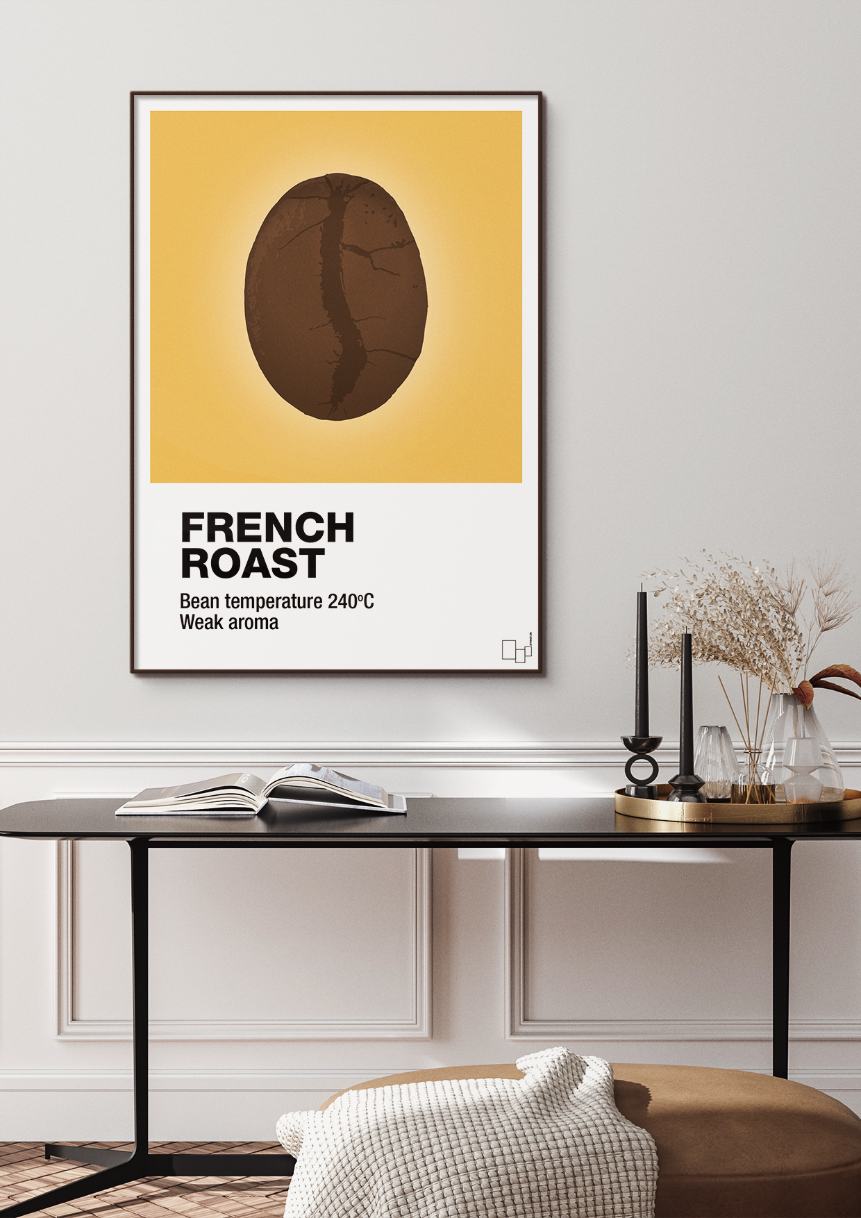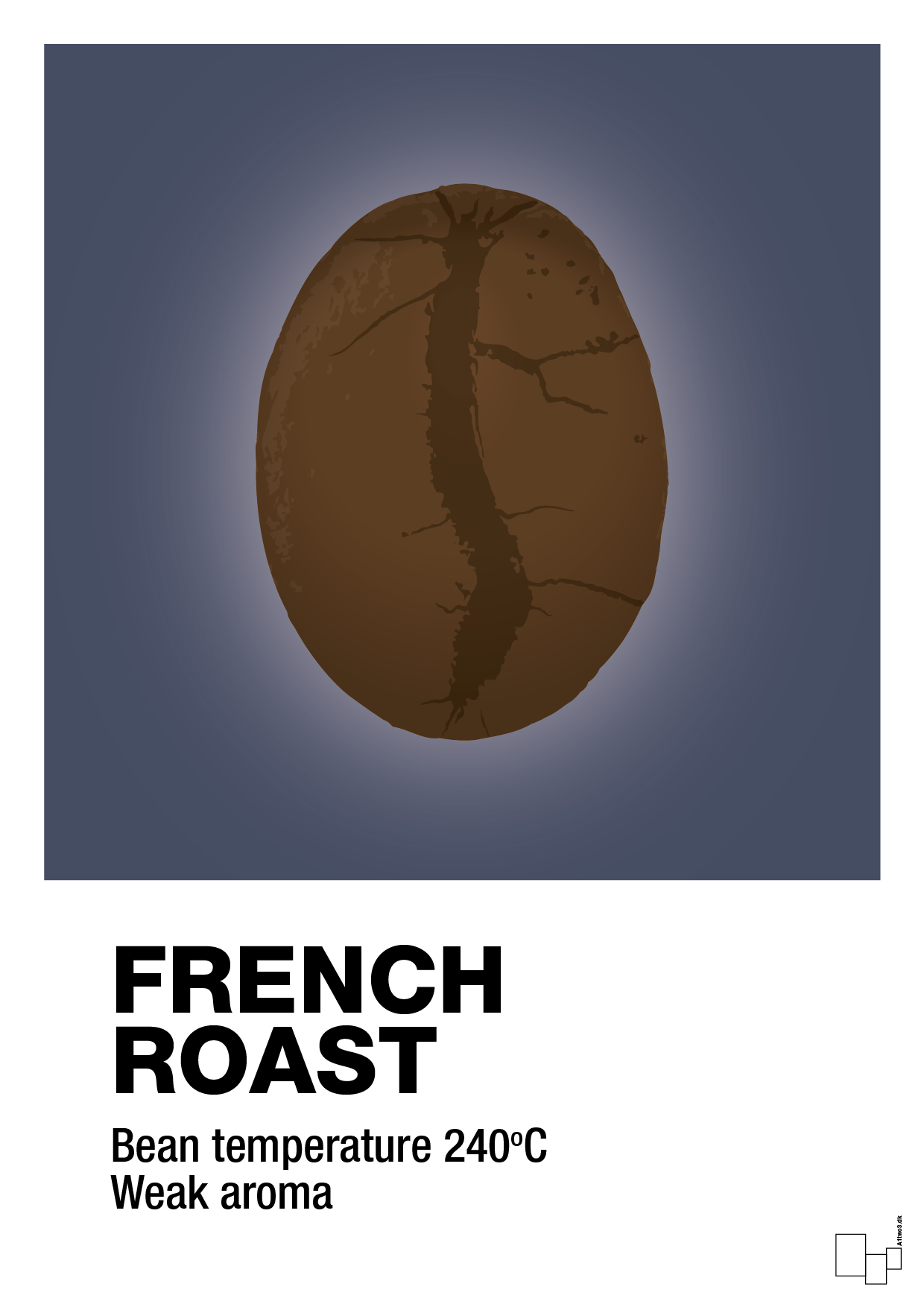 Denne friske og grafiske kaffeplakat hylder den klassiske French Roast – ristet helt til grænsen for at fremhæve den mørke, intense karakter. I centrum står en stor, detaljeret kaffebønne, der nærmest svæver på en enkel baggrund, mens typografien nederst præcist angiver ristningsgrad, bønnetemperatur og aroma. Resultatet er en stilren kaffe plakat, der både taler til smagsløg og øjne.