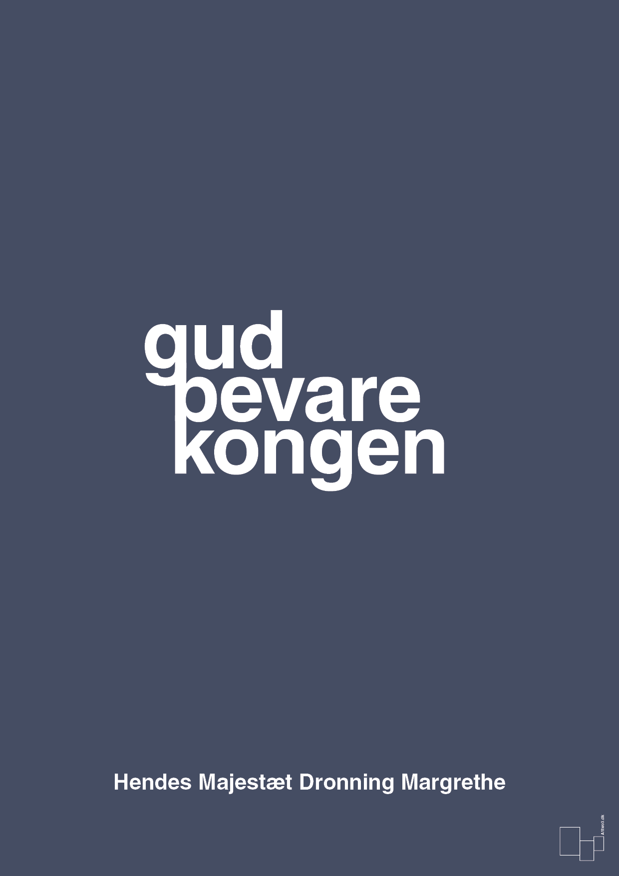 Denne typografiske plakat samler et ikonisk kongeligt citat i et skarpt, grafisk udtryk: “gud bevare kongen” – efterfulgt af signaturen “Hendes Majestæt Dronning Margrethe”. Et enkelt, men stærkt statement, der både hylder det danske kongehus og vores fælles kulturarv, fortolket i et moderne, skandinavisk design.