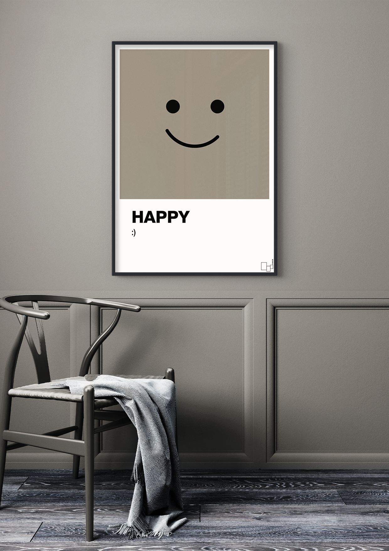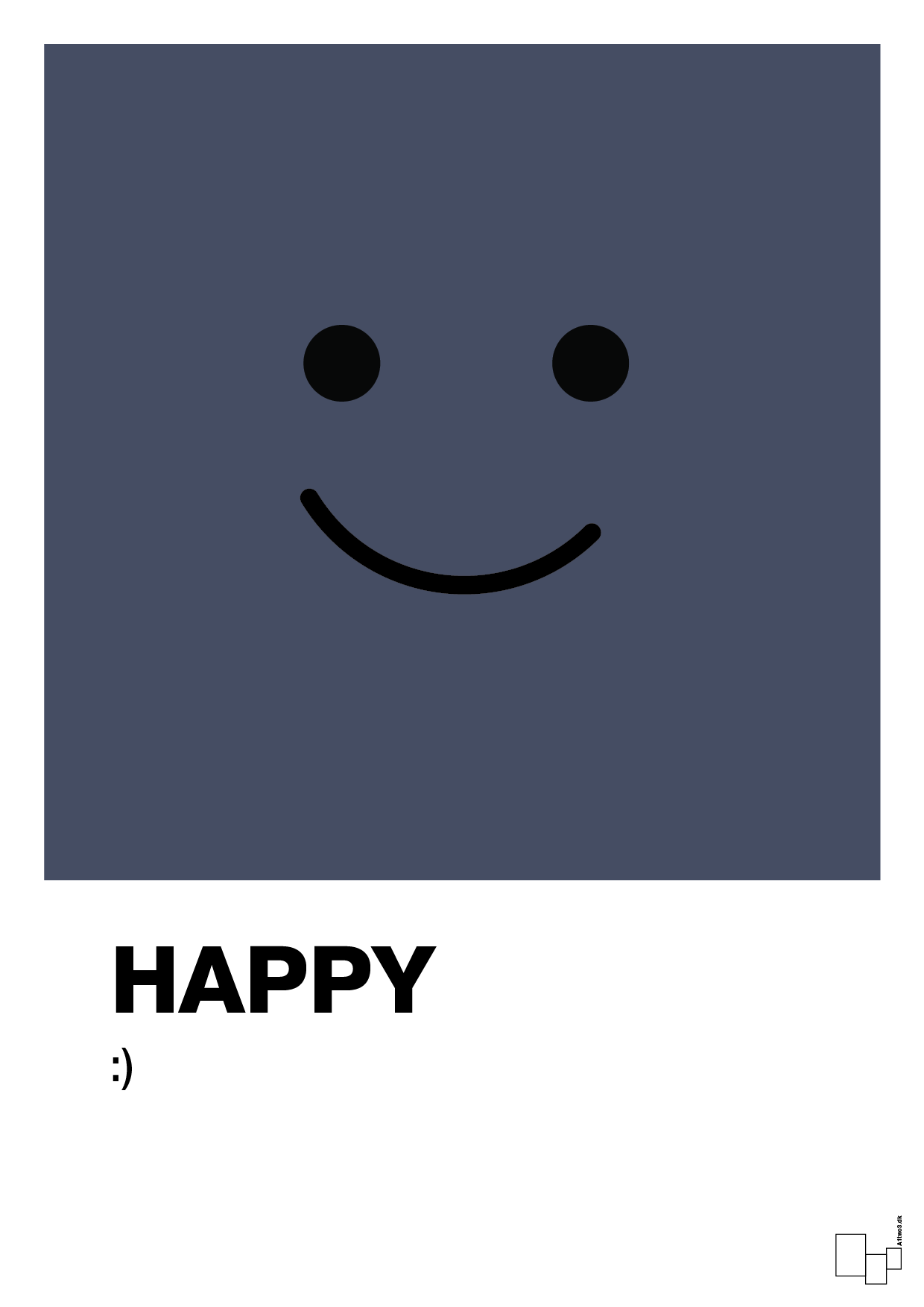 “Happy smiley” er en enkel, grafisk plakat, der gør én ting – og gør den fuldt ud: den minder dig om at være glad. Den store, minimalistiske smiley kombineret med ordet HAPPY og den ikoniske “:)” skaber et humoristisk, positivt statement, der er svært ikke at smile af.