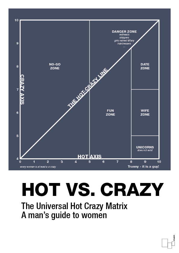 Denne plakat er til dig, der elsker skæv humor, memes og ikoniske internettets-koncepter – og som ikke er bange for at grine lidt af datinglivet. Hot Crazy Matrix-plakaten visualiserer det berømte diagram over, hvordan mænd vurderer kombinationen af “hot” og “crazy” i jagten på den rette partner. Resultatet er en skarp, grafisk og overraskende elegant fortolkning af et kultfænomen, der får de fleste til at trække på smilebåndet.