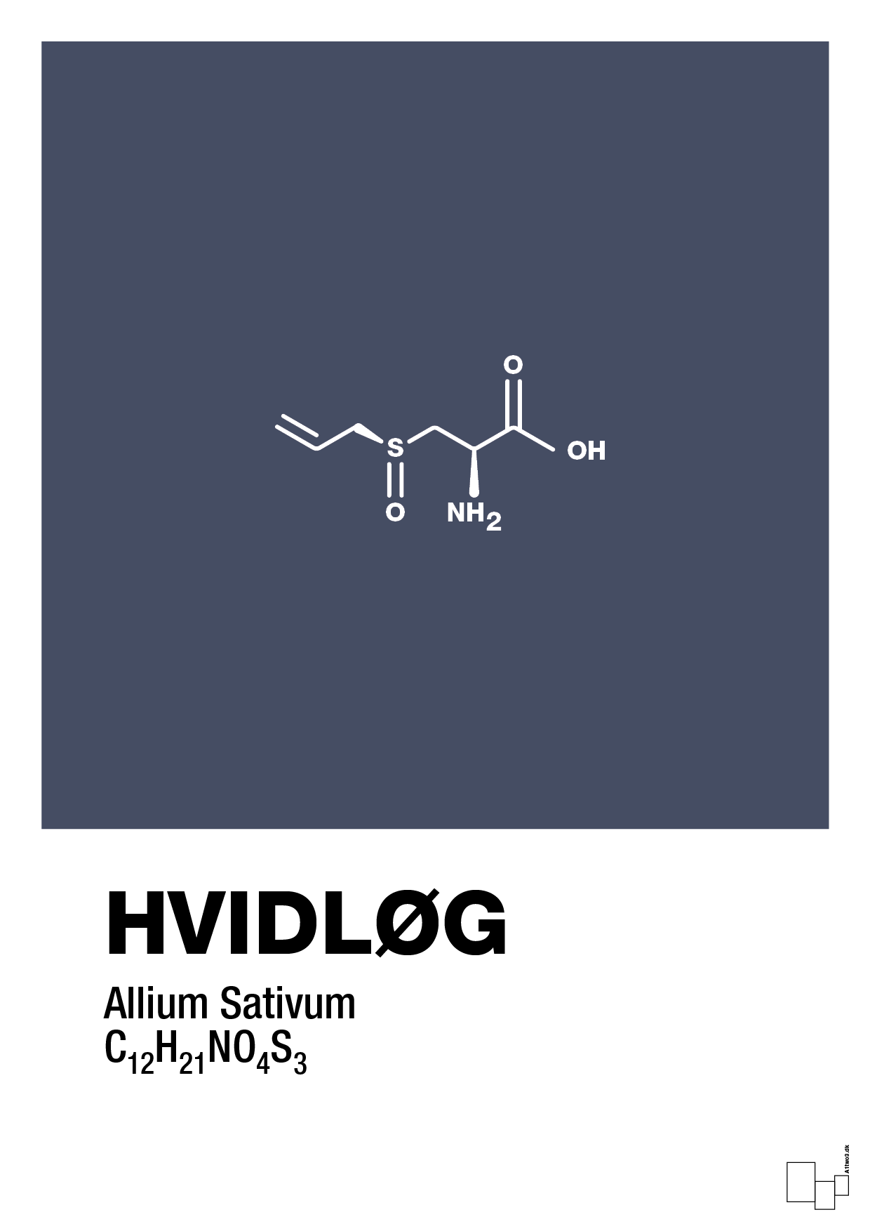 Denne hvidløg plakat forener gastronomi og kemi i ét skarpt, grafisk udtryk. Øverst ses den stiliserede strukturformel for det aktive stof i hvidløg, nedtonet og præcist optegnet som et moderne molekyle-diagram. Nederst binder ordet “HVIDLØG”, den latinske betegnelse Allium Sativum og den kemiske formel motivet sammen i et typografisk stærkt design.