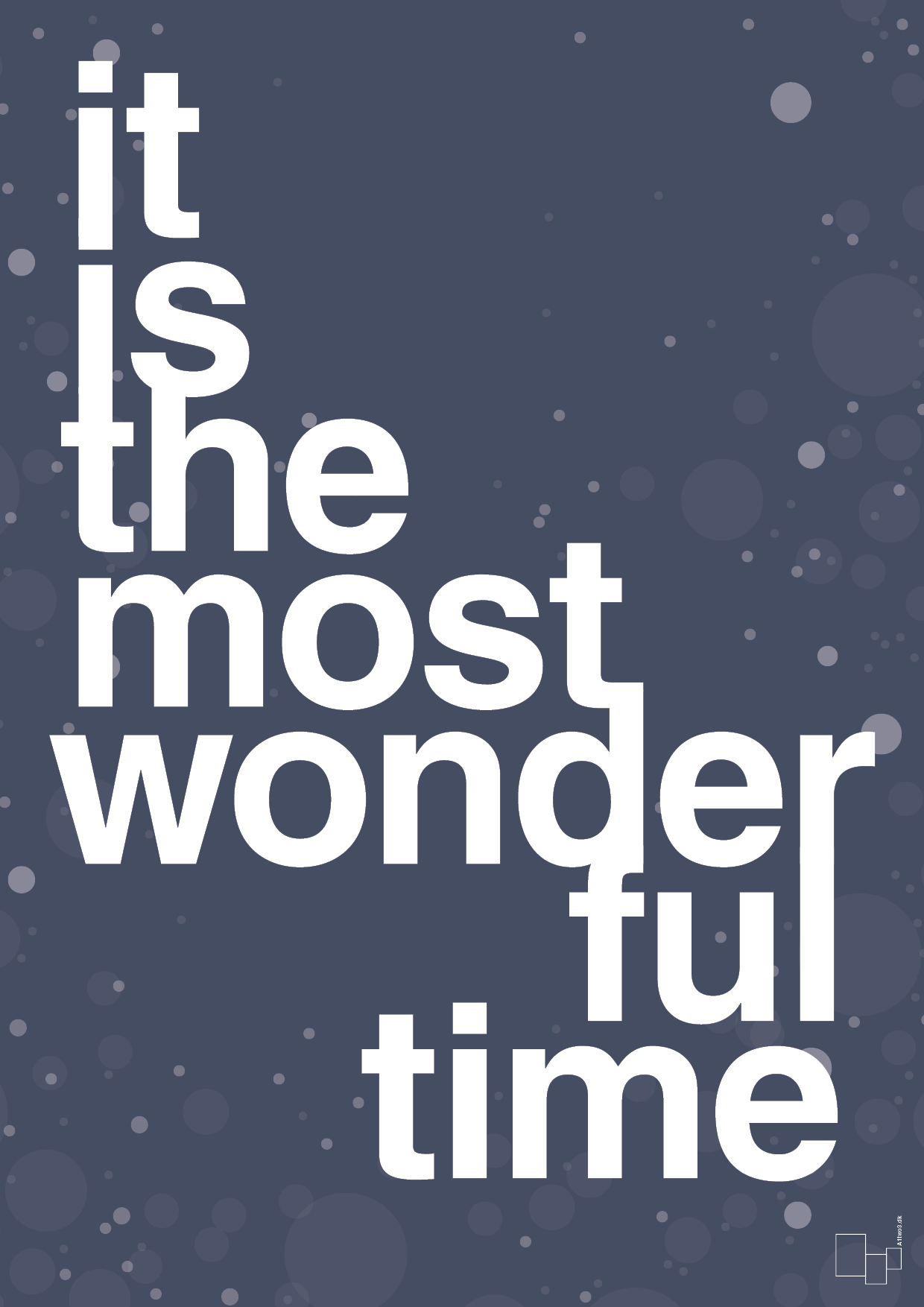 “It is the most wonderful time” – mere skal der næsten ikke til for at sætte den rette julestemning. Denne grafiske juleplakat fra A1two3 er skabt til dig, der elsker jul, men foretrækker et minimalistisk og moderne udtryk frem for nisser og glitter. Den store, hvide typografi står skarpt på den rolige baggrund, mens de diskrete cirkler giver følelsen af snefnug eller lysprikker i vintermørket.