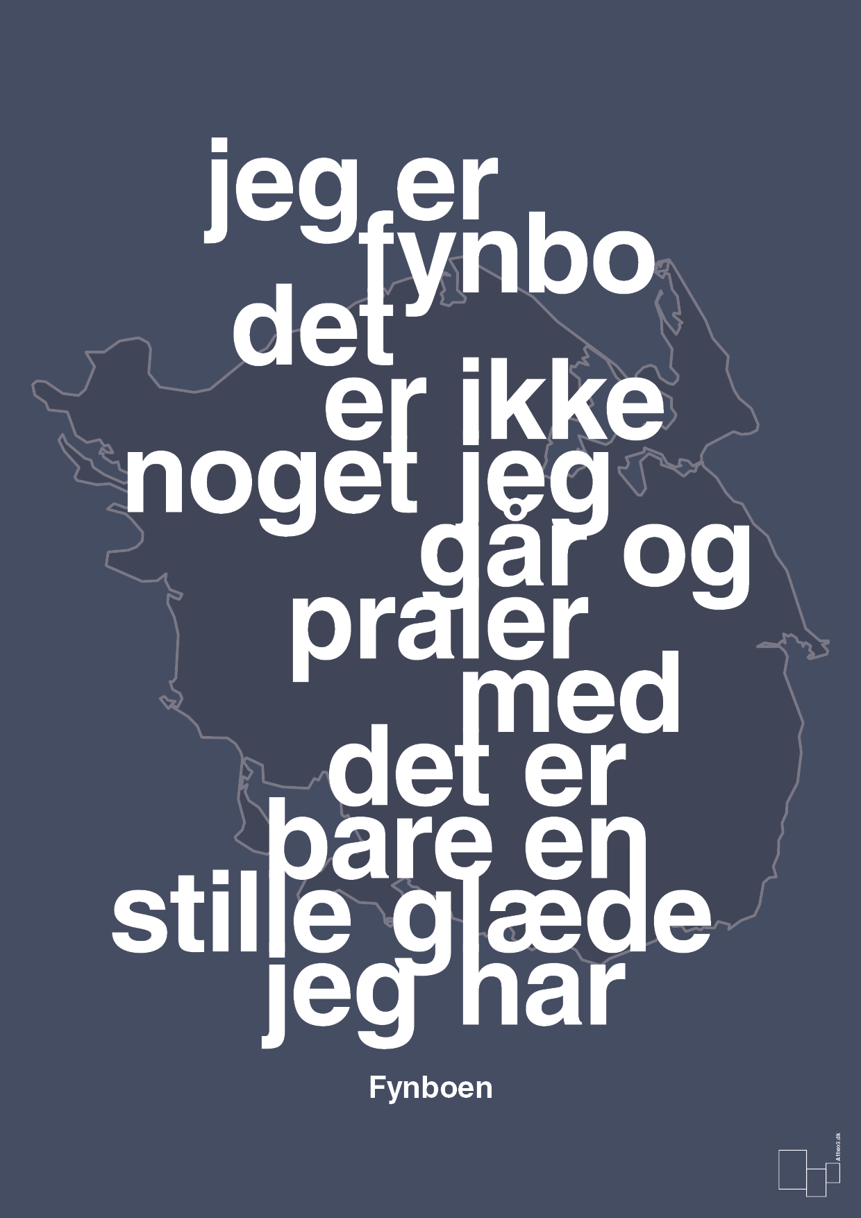 I baggrunden anes Fyns silhouet som en diskret stregtegning, mens teksten står skarpt og dominerende i midten. Det typografiske fokus og det rene layout gør plakaten både moderne, stilren og let at integrere i indretningen – uanset om den hænger alene eller som del af en billedvæg.