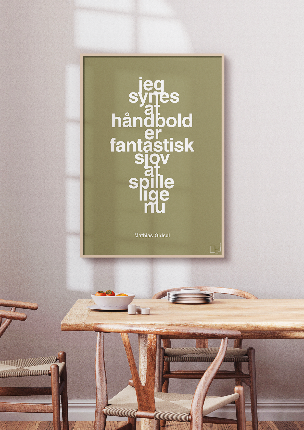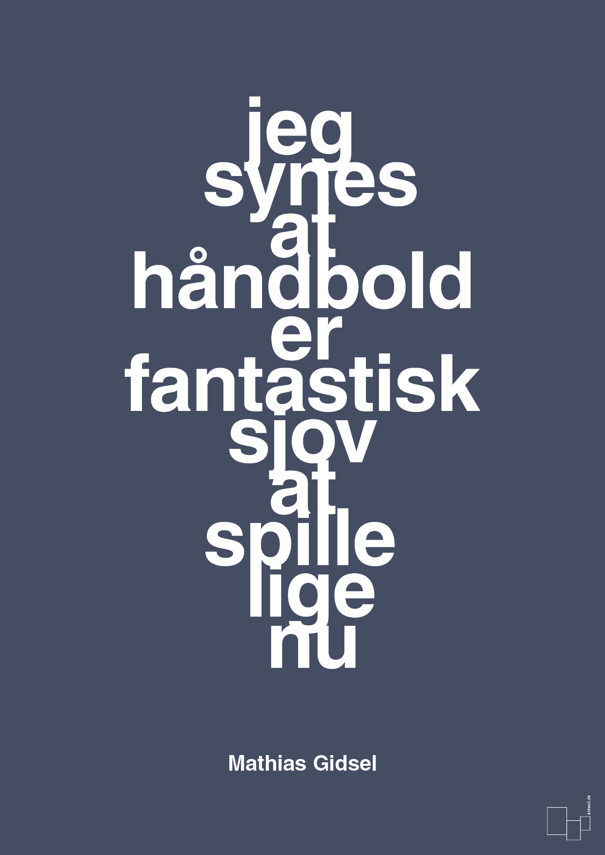 Plakaten er designet i et rent, skandinavisk udtryk, hvor teksten er i centrum. De tætte linjer og den vertikale komposition giver et grafisk, urbant look, der fungerer både som sportsplakat og som moderne kunst på væggen. Nederst finder du navnet Mathias Gidsel