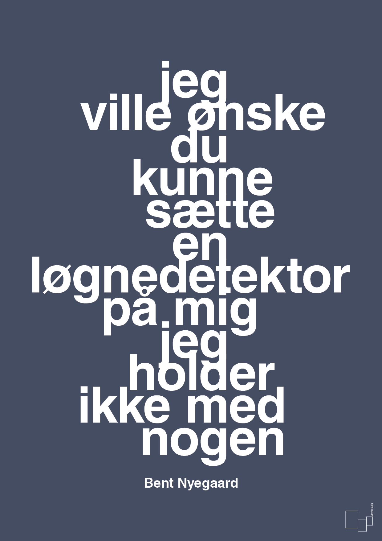 Plakaten er opbygget som et rent typografisk design, hvor de store, hvide bogstaver står tæt og kompakt i en vertikal blok midt på fladen. Det giver et markant, moderne og skandinavisk udtryk, der både fungerer som kunstplakat og samtalestarter. Det stringente layout og de klare kontraster gør den let at matche med andre plakater i en billedvæg.