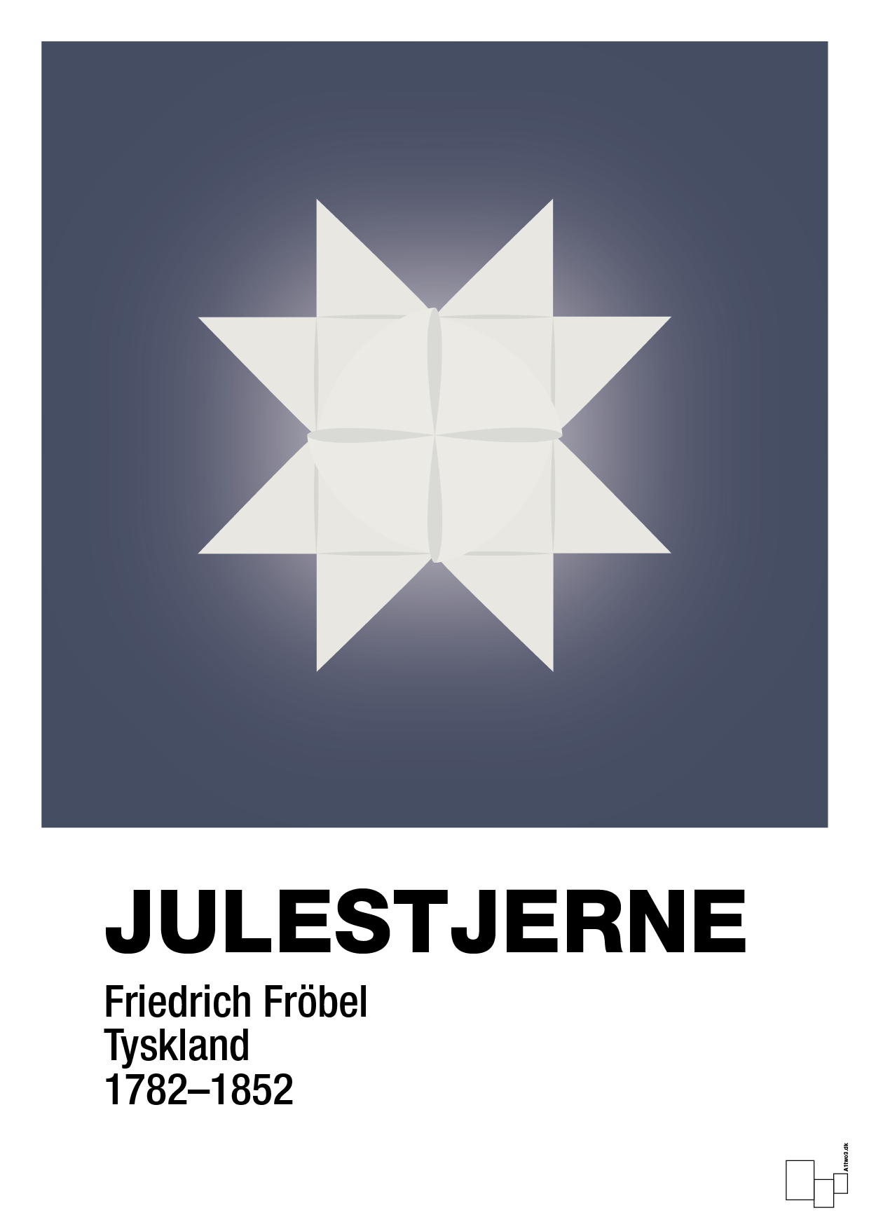 Denne stilrene juleplakat fra A1two3 fortolker den klassiske flettede julestjerne som et enkelt, grafisk ikon. Midt på plakaten svæver en lysende, geometrisk stjerne mod en rolig, mørk baggrund, der giver en elegant og moderne julestemning uden at blive overdådig. Det nederste tekstfelt fortæller kort om julestjernens oprindelse og krediterer pædagogen Friedrich Fröbel, så din julepynt får et både dekorativt og historisk lag.