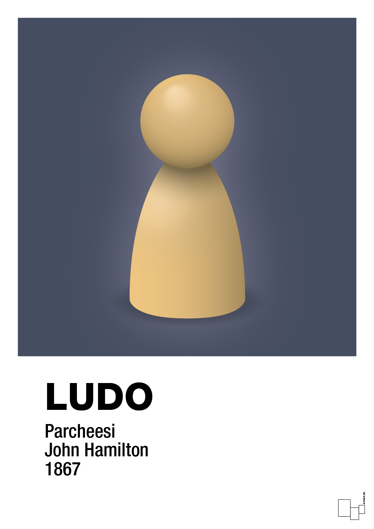 Denne plakat fortolker den klassiske ludobrik som et enkelt, ikonisk designobjekt. Den velkendte spillebrik står skarpt i centrum med bløde skygger og et roligt, grafisk baggrundsfelt, der giver et elegant, næsten skulpturelt udtryk. En stilren plakat, der både signalerer leg, nostalgi og kærlighed til brætspil.