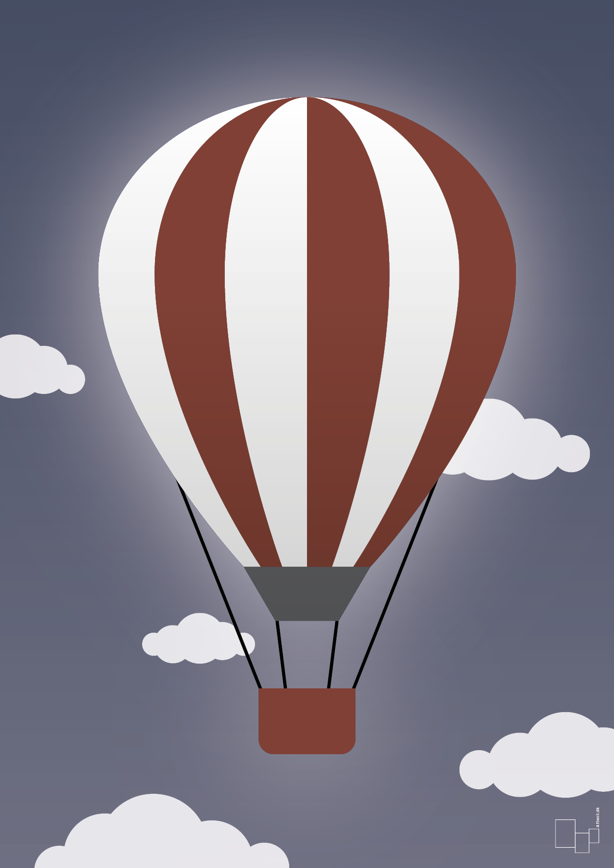 Denne luftballon plakat fra A1two3 indfanger følelsen af at svæve roligt over skyerne i et stilrent, skandinavisk design. Den enkle, grafiske luftballon står markant i motivets centrum, omgivet af bløde skyer og en rolig himmel, der giver billedet et let drømmende og nostalgisk udtryk.
