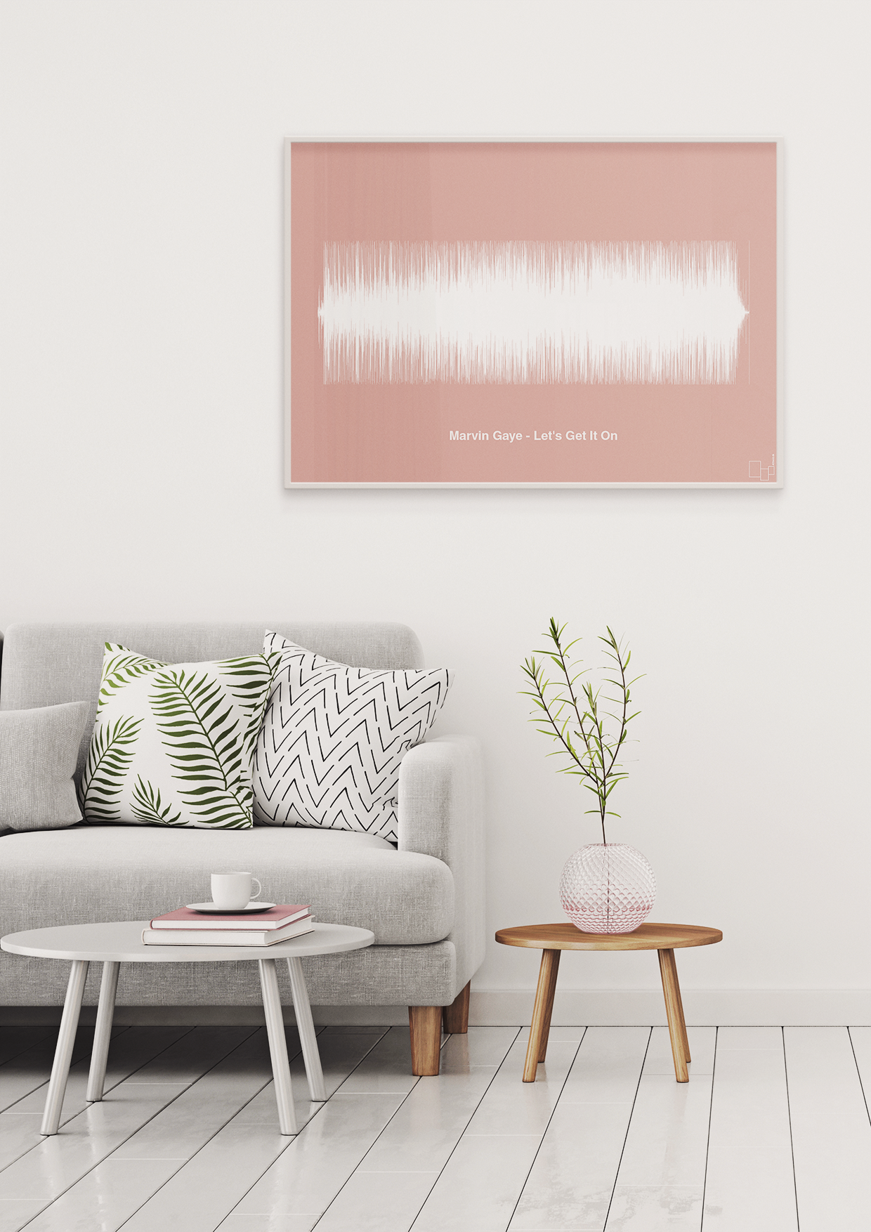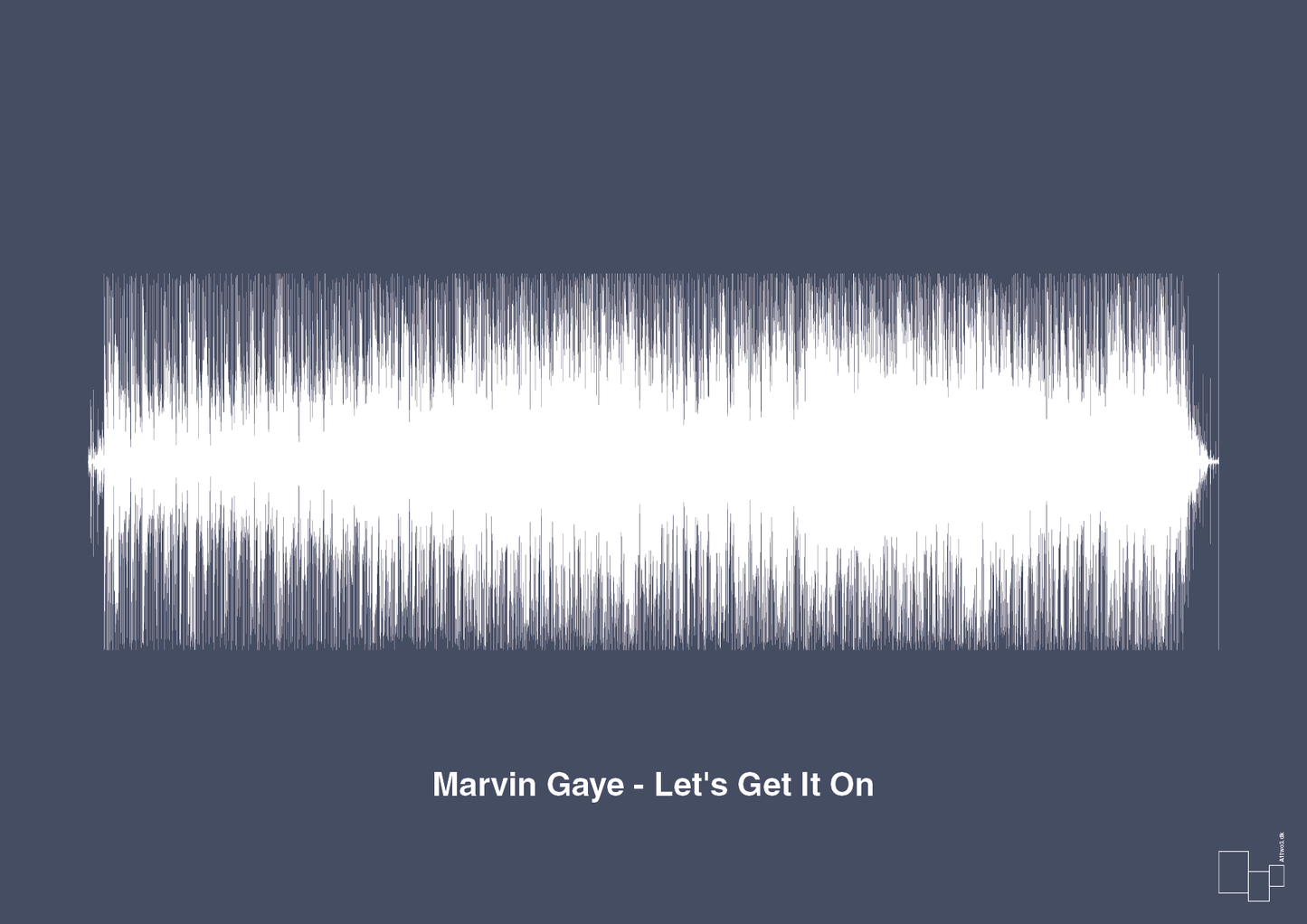 Denne plakat fra A1two3 forvandler Marvin Gayes ikoniske kærlighedssang “Let’s Get It On” til et minimalistisk kunstværk. Hele nummeret er gengivet som en detaljeret lydbølge, der strækker sig horisontalt hen over plakaten og skaber et markant grafisk udtryk. Under lydbølgen står sangtitel og kunstner enkelt og præcist, som et diskret nik til musikhistorien.