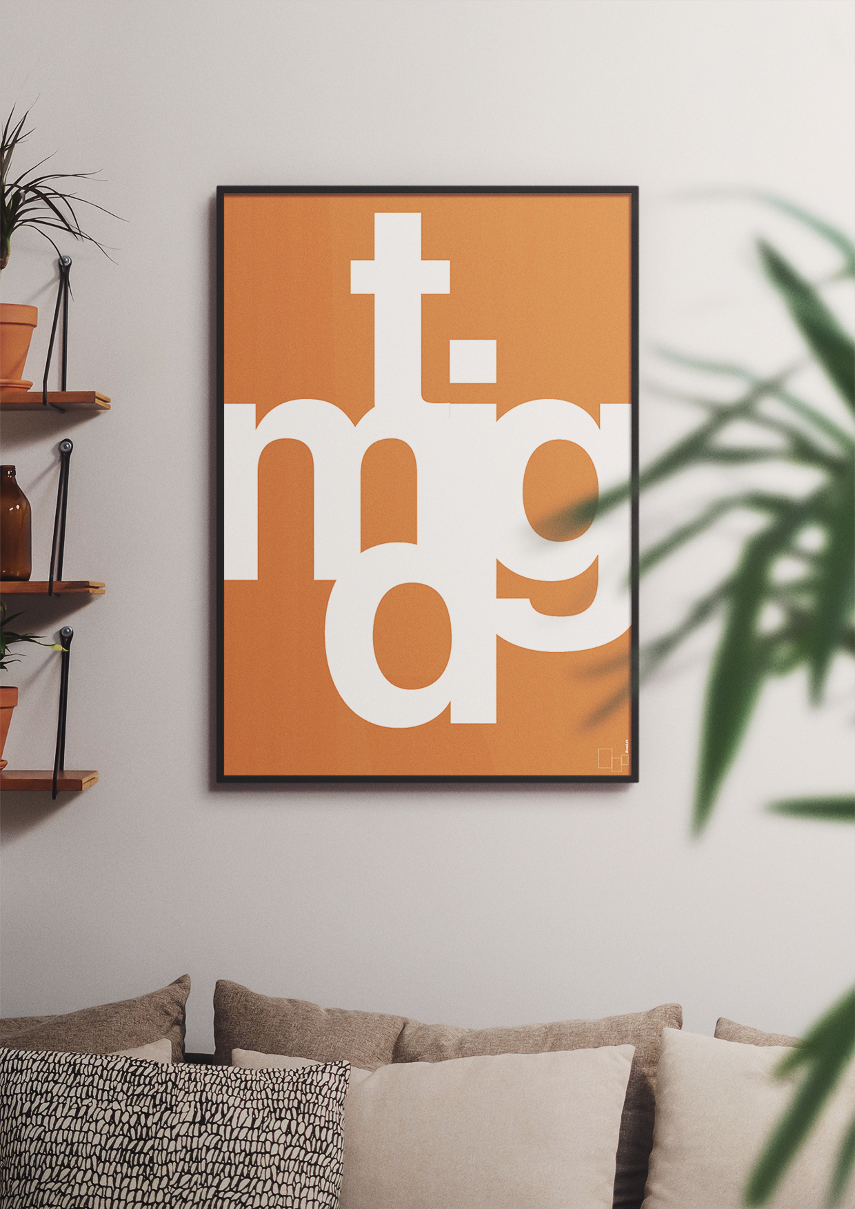 “Mig tid” er en typografisk plakat, der med få, store bogstaver minder dig om noget af det vigtigste i hverdagen: at sætte tid af til dig selv. De overlappende bogstaver skaber et markant, grafisk udtryk, der både føles retro og ultramoderne på samme tid. Resultatet er en feel good plakat, der spreder positive vibes og et stille wink om at slappe lidt af.