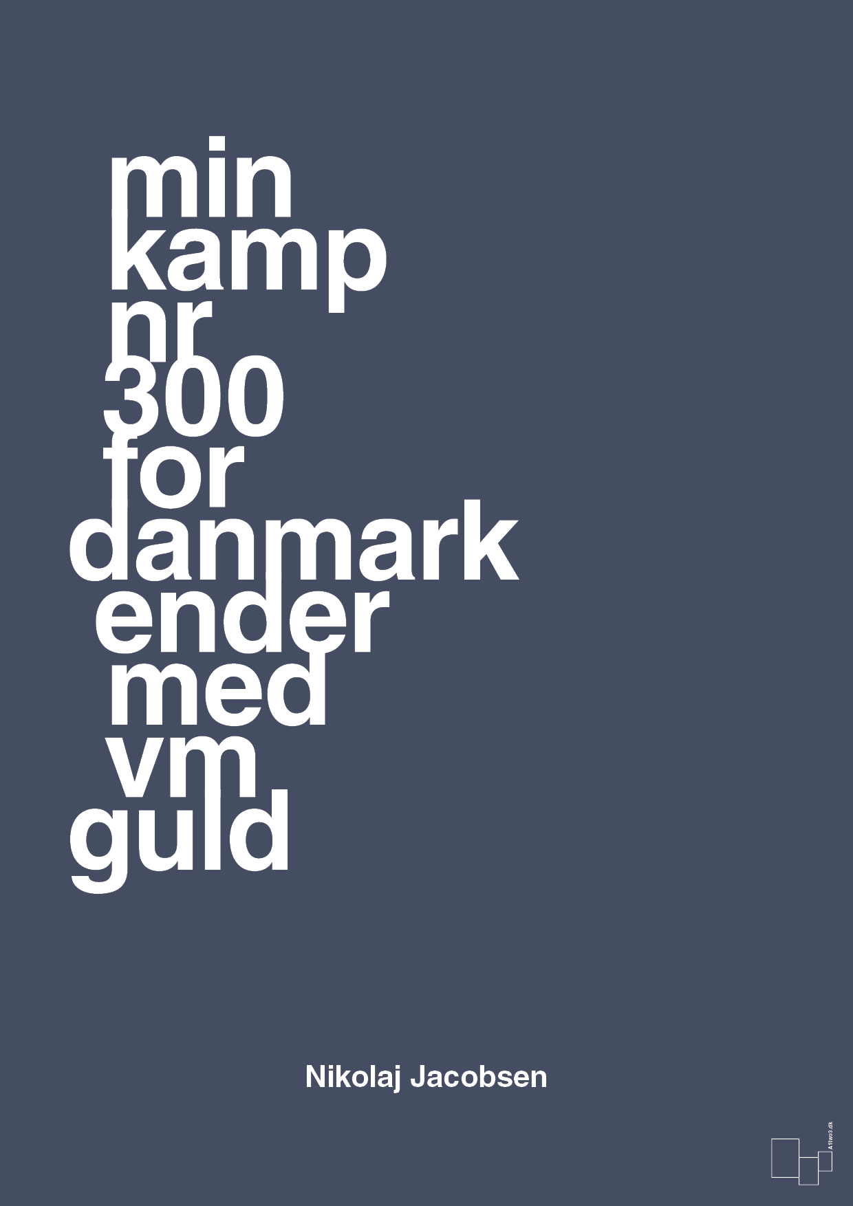 Denne håndbold plakat fanger essensen af dansk landsholdshåndbold med et enkelt, ikonisk citat: “min kamp nr 300 for danmark ender med vm guld”. Ordene står i fokus i et stramt, typografisk design, hvor teksten er sat som et markant, grafisk element på en ensfarvet baggrund. Nederst står afsenderen – Nikolaj Jacobsen – som en diskret, men stærk signatur.