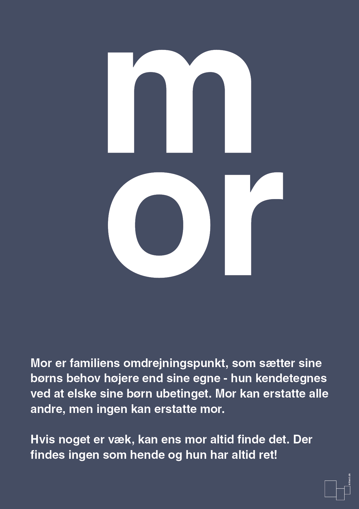 Plakaten definerer mor som den, der sætter sine børns behov over alt andet, elsker ubetinget og altid kan finde det, der er væk – og som (selvfølgelig) altid har ret. Et genkendeligt smil på væggen, der rammer både børn og voksne.
